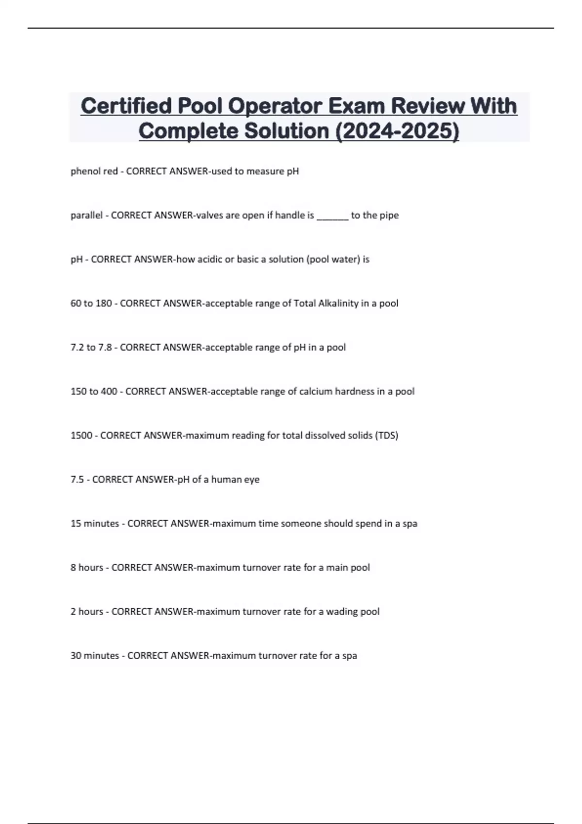 Certified Pool Operator Exam Review With Complete Solution ()