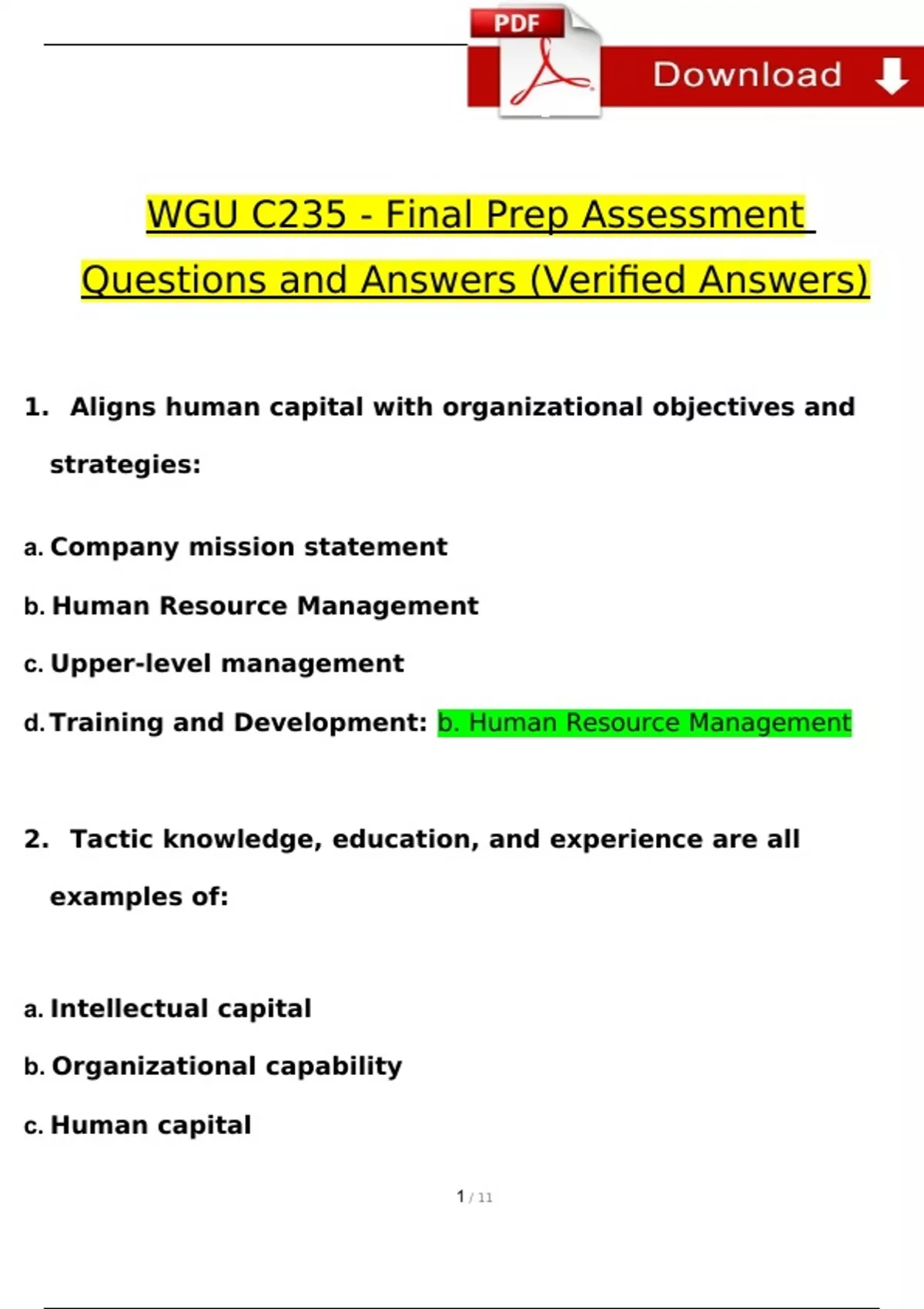 C235 Exam Expected Questions and Answers (Verified by Expert) C235 Exam Expected Questions and Answers (Verified by Expert) C235 Exam Expected Questions and Answers (Verified by Expert) Assessment Questions and Answers (Verified Answers) 1. Aligns human capital with organizational objectives and strategies: a. Company mission statement b. Human Resource Management c. Upper-level management d. Training and Development: b. Human Resource Management 2. Tactic knowledge, education, and experience are all examples of: a. Intellectual capital b. Organizational capability c. Human capital d. Social capital: c. Human capital 3. Sustainable competitive advantage is built upon: a. Organizational commitment b. Intangible resources c. Business strategy d. Training and development: d. Training and development 4. According to the stages of HR Competency, developing credibility and a reputation are both part of what stage? Influencing Mastering Applying Acquiring: Applying 5. Which of the following is the responsibility of line management and not the human resources department? a. Coordinates career planning and employee development efforts b. Prepares knowledge and skill training materials c. Provides feedback on the effectiveness of formal training efforts d. Provides input and expertise for individual and organizational development efforts: c. Provides feedback on the effectiveness of formal training efforts 6. The goal of needs assessment is to: I: Determine whether a training need exists II: Who it is that needs the training III: Where in the organization the need exists IV: Exactly what kind of training is needed a. I, III, and IV b. I, II, and IV c. I, II, and III d. I, II, III, and IV: a. I, III, and IV 7. What are the three levels of needs assessment? a. Behavior, organizational, and analysis b. Analysis, implementation, and feedback c. Organizational, task, and person d. Task, behavior, and feedback: c. Organizational, task, and person 8. A learning objective should be a/an objective. Performance Behavior Obtainable Skill: Behavior 9. What can be the most powerful kind of feedback for learning? Positive Reflection Observation Negative: Observation 10. Concrete experience, reflective observation, abstract conceptualization, and active experimentation are all examples of: a. Learning approaches b. Learner characteristics c. Learning styles d. Learner categories: a. Learning approaches 11. In order to be ready for training, trainees need high self-efficacy. In other words, trainees need: a. The motivation and determination to make the training beneficial b. Personal ambitions and goals c. To feel they are of worth to the company d. To believe they are capable of learning the material: d. To believe they are capable of learning the material 12. Training and development methods can be divided into three categories: a. Simulation, behavior, and information presentation b. Information presentation, skills, and technical c. Behavior, skills, and technical d. Information presentation, simulation, and on-the-job: d. Information presen- tation, simulation, and on-the-job 13. Sensitivity training is an example of: a. Information presentation training b. Simulation training c. On-the-job training d. All of the above: b. Simulation training 14. What is currently the most common approach to training? a. E-learning b. External learning c. Classroom learning d. Blended learning: c. Classroom learning 15. A variation of e-learning: a. Self study b. Case studies c. Blended learning d. Virtual classroom learning: c. Blended learning 16. During which step of the on-the-job training process do you make sure trainees know each point of the training? a. Perform follow-up b. Prepare the learners c. Present the information d. Have trainee practice: c. Present the information 17. Is able to relate practical experiences, and conduct problem solving exer- cises: a. Communication expert b. Consultant c. Training expert d. Subject matter expert: d. Subject matter expert 18. Learning in training that does not affect performance on the job is called: Negative transfer Wasted training Zero transfer Unsuccessful training: Zero transfer 19. What are the two types of positive transfer? Future and current Near and far Established and successful Actual and perceived: Near and far 20. Traits, ability, and motivation are all considered: Training design Trainee characteristics Work environment Trainer characteristics: Trainee characteristics