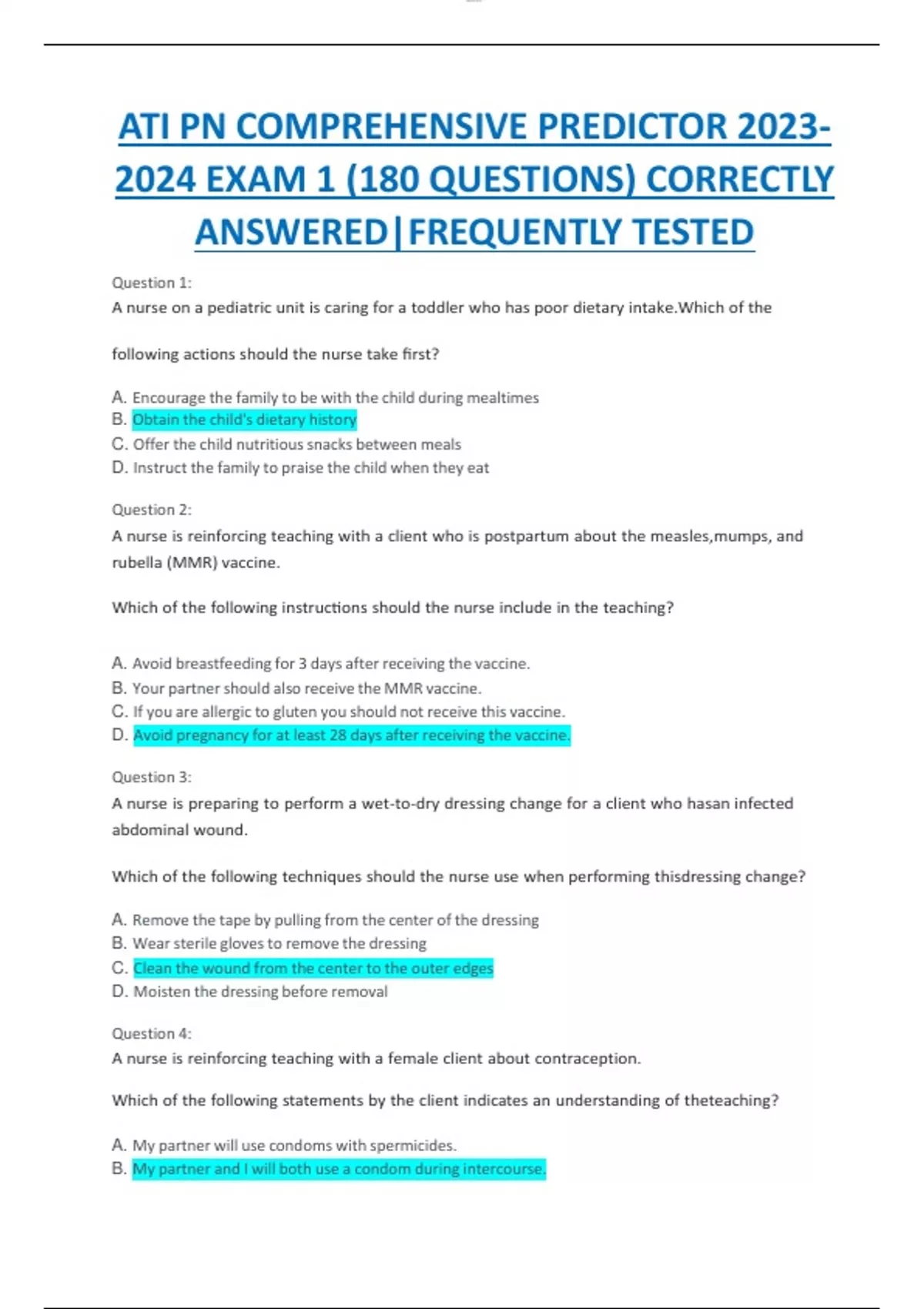 ATI PN COMPREHENSIVE PREDICTOR EXAM 1 (180 QUESTIONS) CORRECTLY ANSWERED|FREQUENTLY TESTED