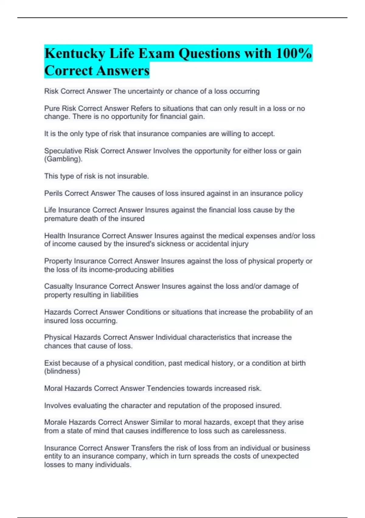 Kentucky Life Exam Questions with 100% Correct Answers