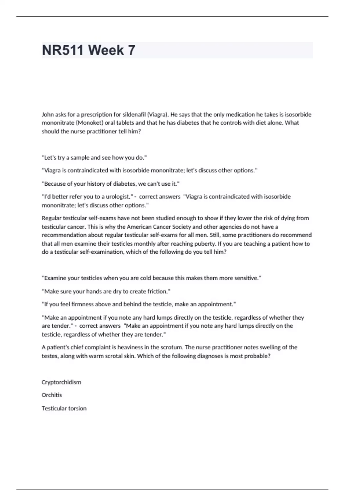 NR511 Week 7 John asks for a prescription for sildenafil (Viagra). He says that the only medication he takes is isosorbide mononitrate (Monoket) oral tablets and that he has diabetes that he controls with diet alone. What should the nurse practitioner tell him? "Let's try a sample and see how you do." "Viagra is contraindicated with isosorbide mononitrate; let's discuss other options." "Because of your history of diabetes, we can't use it." "I'd better refer you to a urologist." - correct answers "Viagra is contraindicated with isosorbide mononitrate; let's discuss other options." Regular testicular self-exams have not been studied enough to show if they lower the risk of dying from testicular cancer. This is why the American Cancer Society and other agencies do not have a recommendation about regular testicular self-exams for all men. Still, some practitioners do recommend that all men examine their testicles monthly after reaching puberty. If you are teaching a patient how to do a testicular self-examination, which of the following do you tell him? "Examine your testicles when you are cold because this makes them more sensitive." "Make sure your hands are dry to create friction." "If you feel firmness above and behind the testicle, make an appointment." "Make an appointment if you note any hard lumps directly on the testicle, regardless of whether they are tender." - correct answers "Make an appointment if you note any hard lumps directly on the testicle, regardless of whether they are tender." A patient's chief complaint is heaviness in the scrotum. The nurse practitioner notes swelling of the testes, along with warm scrotal skin. Which of the following diagnoses is most probable? Cryptorchidism Orchitis Testicular torsion