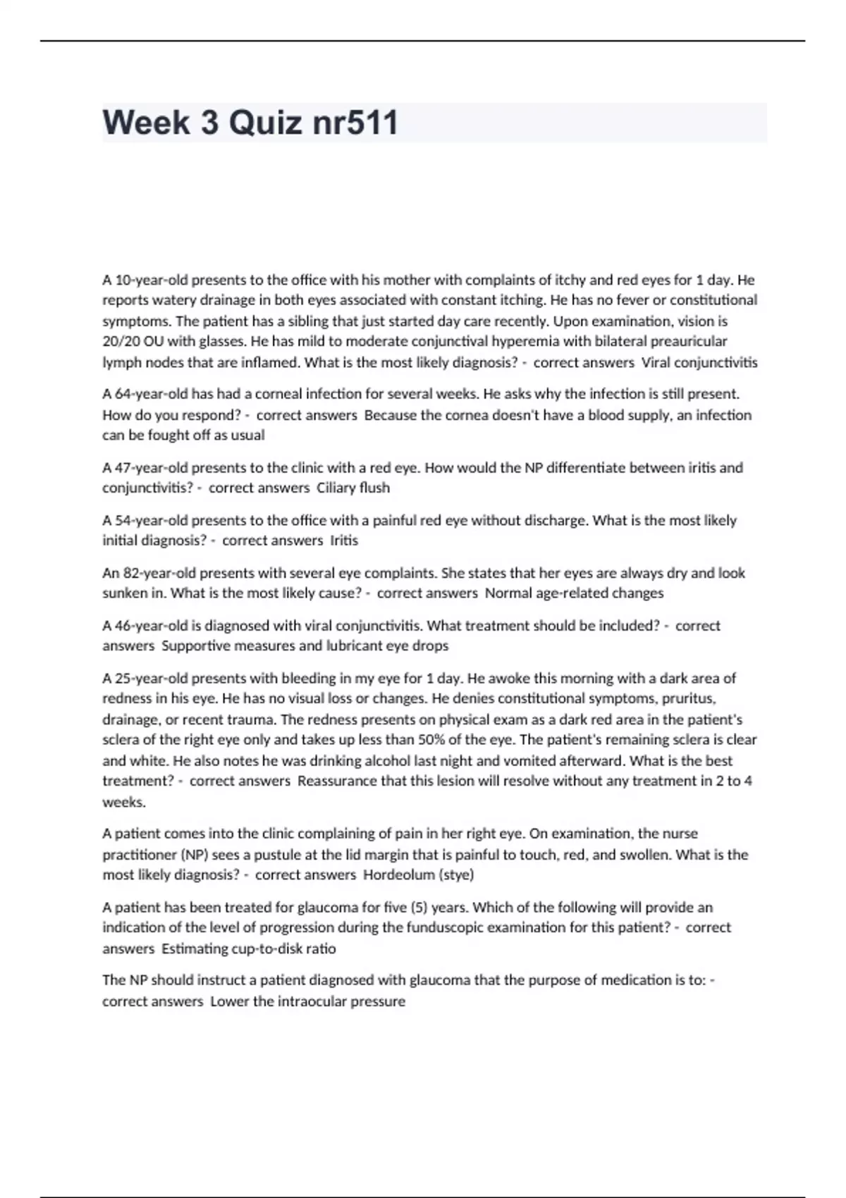 Week 3 Quiz nr511 A 10-year-old presents to the office with his mother with complaints of itchy and red eyes for 1 day. He reports watery drainage in both eyes associated with constant itching. He has no fever or constitutional symptoms. The patient has a sibling that just started day care recently. Upon examination, vision is 20/20 OU with glasses. He has mild to moderate conjunctival hyperemia with bilateral preauricular lymph nodes that are inflamed. What is the most likely diagnosis? - correct answers Viral conjunctivitis A 64-year-old has had a corneal infection for several weeks. He asks why the infection is still present. How do you respond? - correct answers Because the cornea doesn't have a blood supply, an infection can be fought off as usual A 47-year-old presents to the clinic with a red eye. How would the NP differentiate between iritis and conjunctivitis? - correct answers Ciliary flush A 54-year-old presents to the office with a painful red eye without discharge. What is the most likely initial diagnosis? - correct answers Iritis An 82-year-old presents with several eye complaints. She states that her eyes are always dry and look sunken in. What is the most likely cause? - correct answers Normal age-related changes A 46-year-old is diagnosed with viral conjunctivitis. What treatment should be included? - correct answers Supportive measures and lubricant eye drops A 25-year-old presents with bleeding in my eye for 1 day. He awoke this morning with a dark area of redness in his eye. He has no visual loss or changes. He denies constitutional symptoms, pruritus, drainage, or recent trauma. The redness presents on physical exam as a dark red area in the patient's sclera of the right eye only and takes up less than 50% of the eye. The patient's remaining sclera is clear and white. He also notes he was drinking alcohol last night and vomited afterward. What is the best treatment? - correct answers Reassurance that this lesion will resolve without any treatment in 2 to 4 weeks. A patient comes into the clinic complaining of pain in her right eye. On examination, the nurse practitioner (NP) sees a pustule at the lid margin that is painful to touch, red, and swollen. What is the most likely diagnosis? - correct answers Hordeolum (stye) A patient has been treated for glaucoma for five (5) years. Which of the following will provide an indication of the level of progression during the funduscopic examination for this patient? - correct answers Estimating cup-to-disk ratio The NP should instruct a patient diagnosed with glaucoma that the purpose of medication is to: - correct answers Lower the intraocular pressure