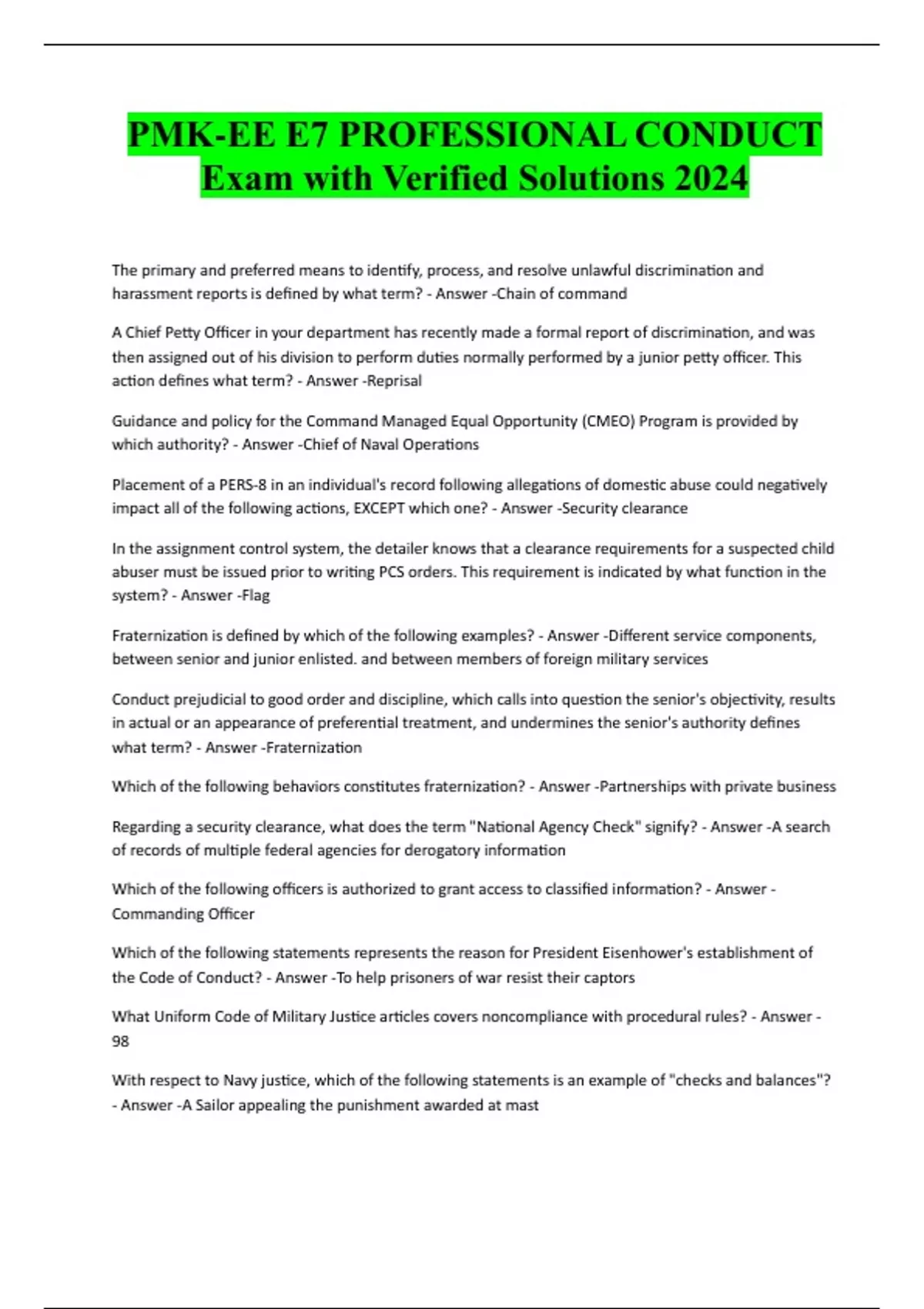 98 With respect to Navy justice, which of the following statements is an example of "checks and balances"? - Answer -A Sailor appealing the punishment awarded at mast "Evade answering further questions to the utmost of my ability' is found in what Code of Conduct article? - Answer -V You should find the General Article under what Uniform Code of Military Justice article? - Answer -134 Which of the following inspections is NOT an authorized type of urinalysis? - Answer -Synthetics test What behavior is considered the number one drug problem in the U.S. Navy? - Answer -Alcohol abuse Management and oversight of the weight management programs is provided by what authority? - Answer -Bureau of Medicine and Surgery Fitness Enhancement Program (FEP) administrative documentation includes all of the following, EXCEPT which one? - Answer -Sleep tracking/monitoring The attack on the USS Cole occurred in what year? - Answer -2000 Regarding force security, RAM is defined by what statement? - Answer -Random, multiple security measure that, when activated, serve to disguise the actual security procedures all matters pertaining to a mishap that can be used for legal or administrative action is documented during what type f investigation? - Answer -Judge Advocate General After a mishap in which an enlisted Sailor is injured, what person or group appoints a qualified individual to ensure that a complete investigation is conducted? - Answer -Commanding officer An unfavorable decision has been made due to an individual rejecting an unwanted sexual behavior. This situation describes what type of sexual harassment? - Answer -Hostile environment Which of the following individuals cannot receive a "Restricted" sexual assault report? - Answer -