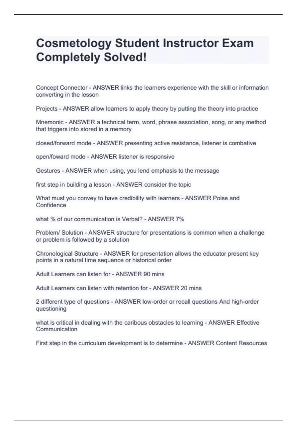 Cosmetology Student Instructor Exam Completely Solved!