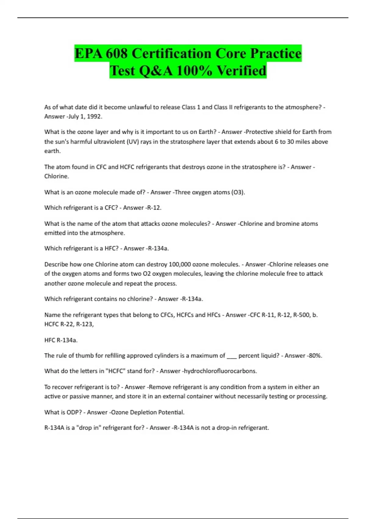 EPA 608 Certification Core Practice Test Q&A 100% Verified As of what date did it become unlawful to release Class 1 and Class II refrigerants to the atmosphere? - Answer -July 1, 1992. What is the ozone layer and why is it important to us on Earth? - Answer -Protective shield for Earth from the sun's harmful ultraviolent (UV) rays in the stratosphere layer that extends about 6 to 30 miles above earth. The atom found in CFC and HCFC refrigerants that destroys ozone in the stratosphere is? - Answer - Chlorine. What is an ozone molecule made of? - Answer -Three oxygen atoms (O3). Which refrigerant is a CFC? - Answer -R-12. What is the name of the atom that attacks ozone molecules? - Answer -Chlorine and bromine atoms emitted into the atmosphere. Which refrigerant is a HFC? - Answer -R-134a. Describe how one Chlorine atom can destroy 100,000 ozone molecules. - A