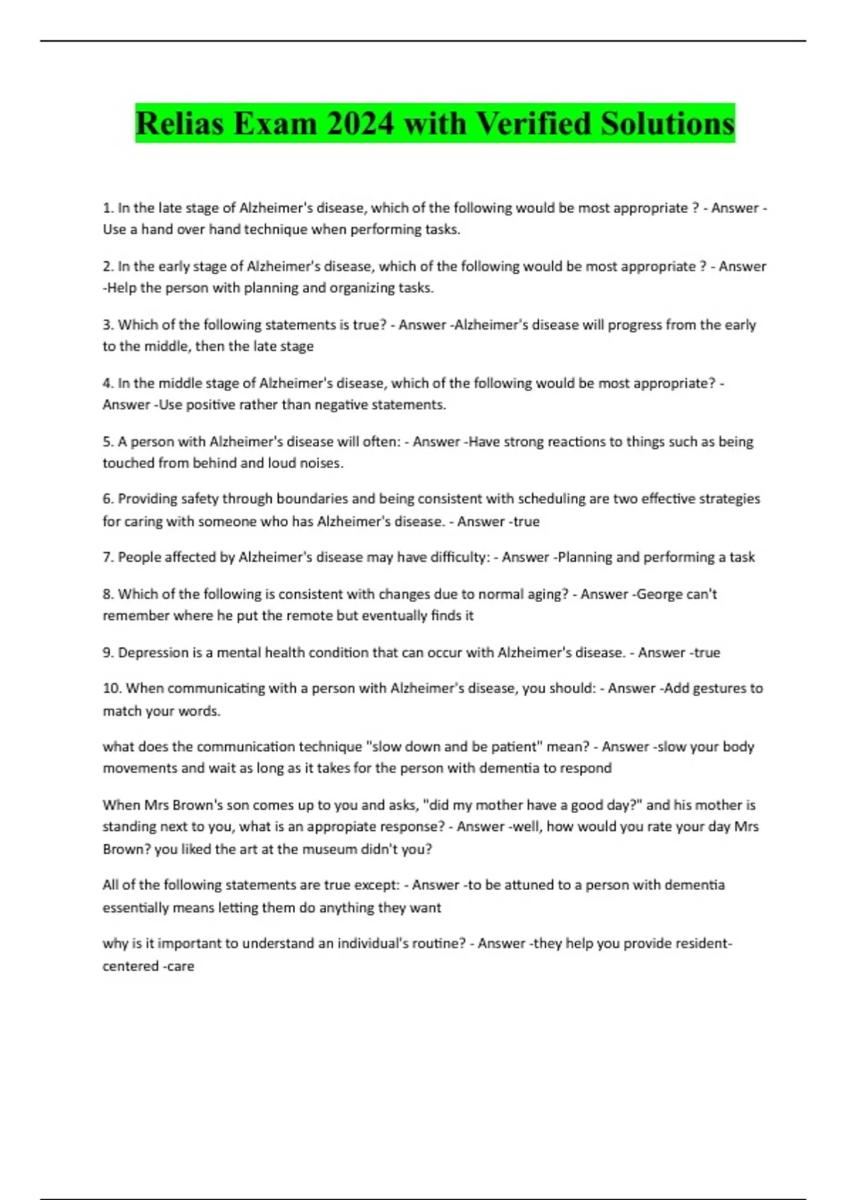 Relias Exam 2024 with Verified Solutions 1. In the late stage of Alzheimer's disease, which of the following would be most appropriate ? - Answer - Use a hand over hand technique when performing tasks. 2. In the early stage of Alzheimer's disease, which of the following would be most appropriate ? - Answer -Help the person with planning and organizing tasks. 3. Which of the following statements is true? - Answer -Alzheimer's disease will progress from the early to the middle, then the late stage 4. In the middle stage of Alzheimer's disease, which of the following would be most appropriate? - Answer -Use positive rather than negative statements. 5. A person with Alzheimer's disease will often: - Answer -Have strong reactions to things such as being touched from behind and loud noises. 6. Providing safety through boundaries and being consistent with scheduling are two effective strategies for caring with someone who has Alzheimer's disease. - Answer -true 7. People affected by Alzheimer's disease may have difficulty: - Answer -Plannin