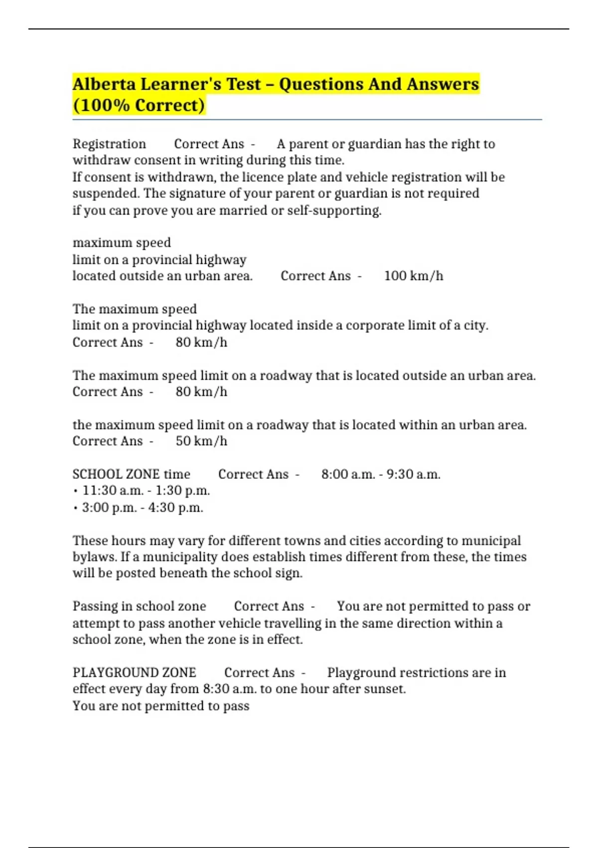 Alberta Learner's Test – Questions And Answers (100% Correct)