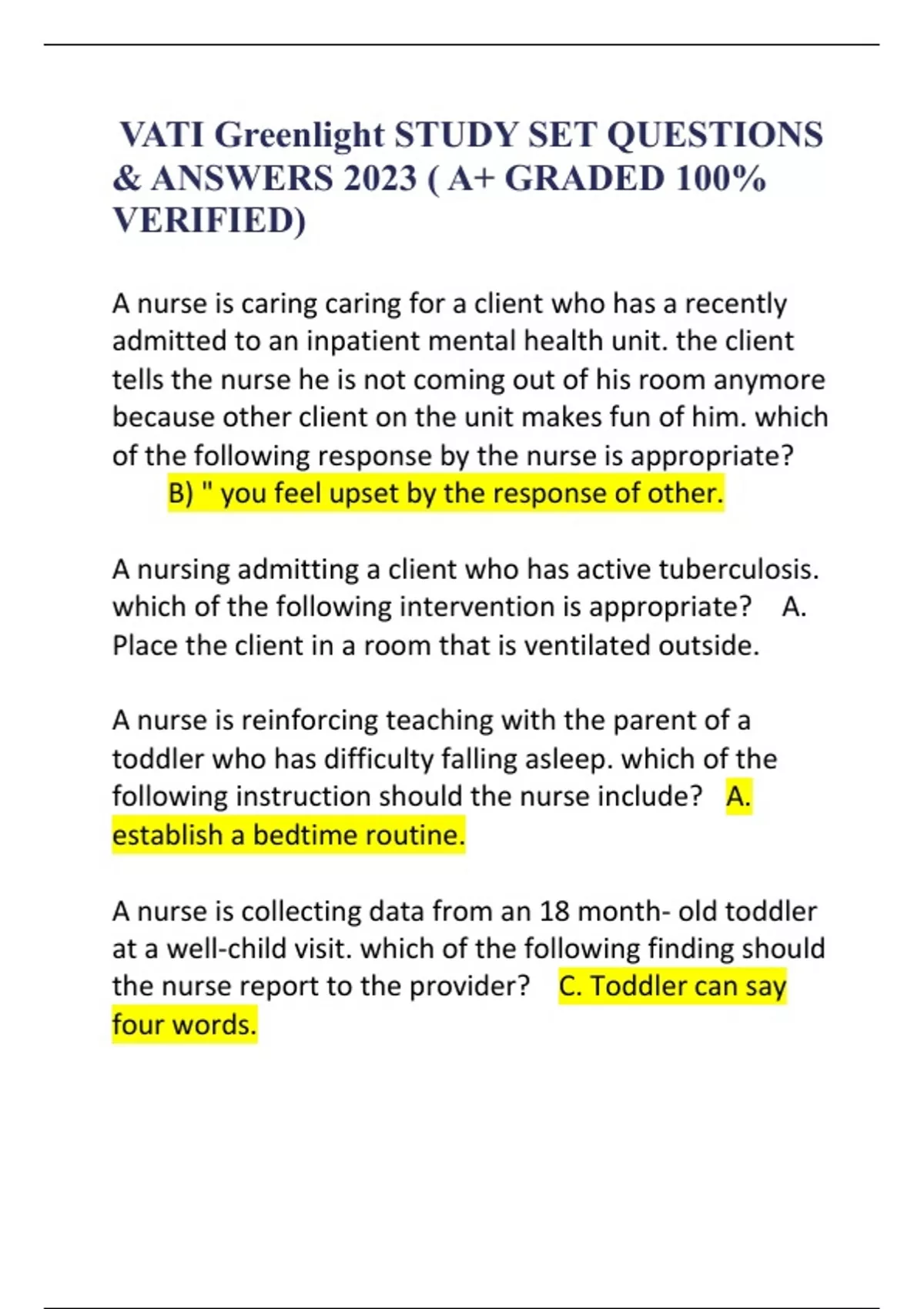 VATI Greenlight STUDY SET QUESTIONS & ANSWERS 2023 ( A+ GRADED 100% VERIFIED