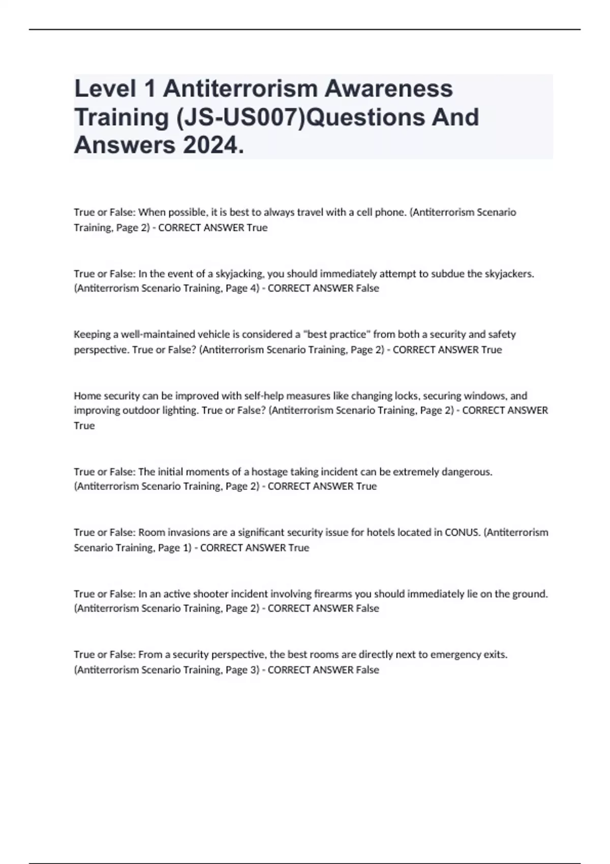 Level 1 Antiterrorism Awareness Training (JS-US007) Study Guide Test 2024. True or False: When possible, it is best to always travel with a cell phone. (Antiterrorism Scenario Training, Page 2) - CORRECT ANSWER True True or False: In the event of a skyjacking, you should immediately attempt to subdue the skyjackers. (Antiterrorism Scenario Training, Page 4) - CORRECT ANSWER False Keeping a well-maintained vehicle is considered a "best practice" from both a security and safety perspective. True or False? (Antiterrorism Scenario Training, Page 2) - CORRECT ANSWER True Home security can be improved with self-help measures like changing locks, securing windows, and improving outdoor lighting. True or False? (Antiterrorism Scenario Training, Page 2) - CORRECT ANSWER True True or False: The initial moments of a hostage taking incident can be extremely dangerous. (Antiterrorism Scenario Training, Page 2) - CORRECT ANSWER True True or False: Room invasions are a significant security issue for hotels located in CONUS. (Antiterrorism Scenario Training, Page 1) - CORRECT ANSWER True True or False: In an active shooter incident involving firearms you should immediately lie on the ground. (Antiterrorism Scenario Training, Page 2) - CORRECT ANSWER False True or False: From a security perspective, the best rooms are directly next to emergency exits. (Antiterrorism Scenario Training, Page 3) - CORRECT ANSWER False