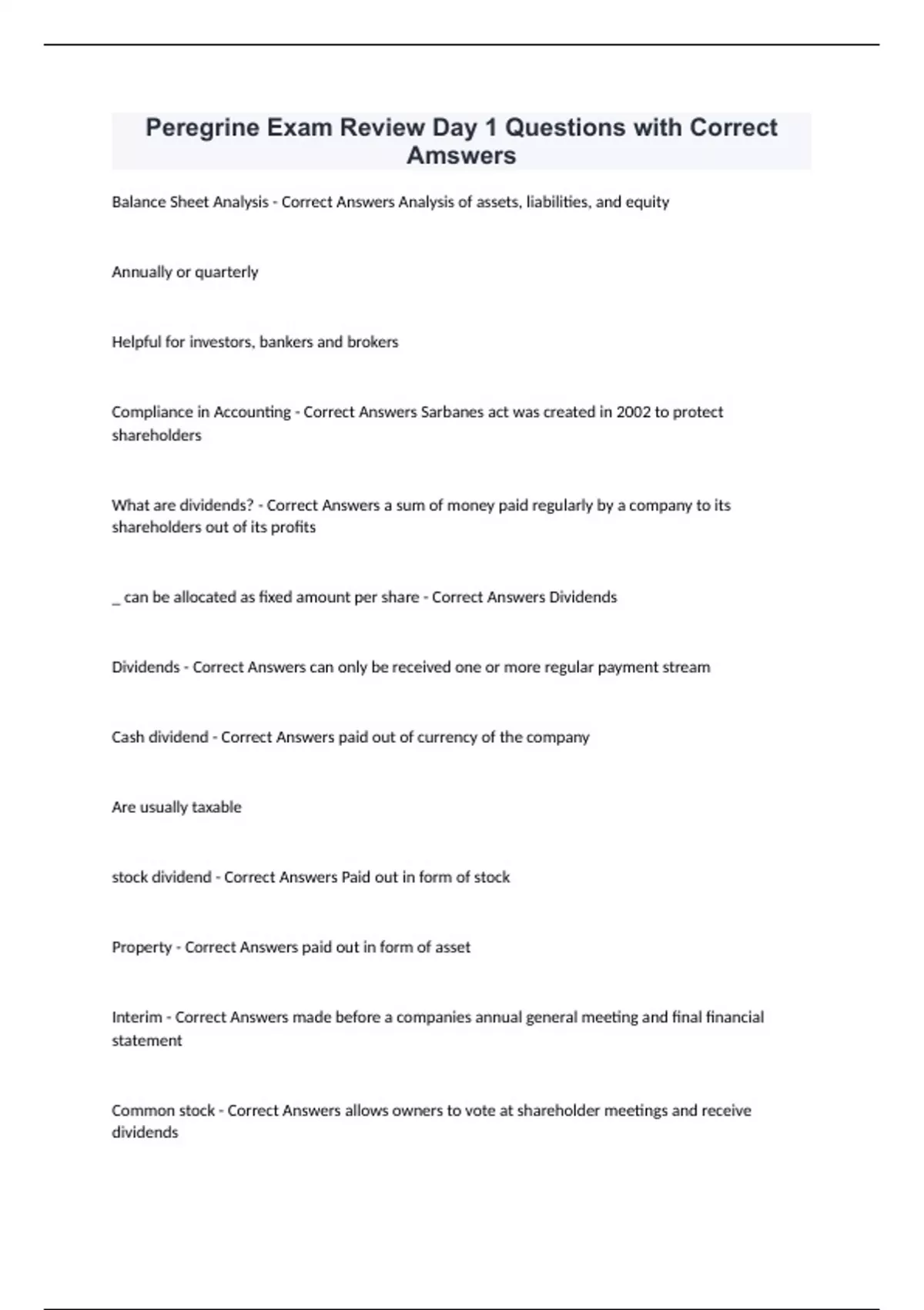 Peregrine Exam Review Day 1 Questions with Correct Answers Balance Sheet Analysis - Correct Answers Analysis of assets, liabilities, and equity Annually or quarterly Helpful for investors, bankers and brokers Compliance in Accounting - Correct Answers Sarbanes act was created in 2002 to protect shareholders What are dividends? - Correct Answers a sum of money paid regularly by a company to its shareholders out of its profits _ can be allocated as fixed amount per share - Correct Answers Dividends Dividends - Correct Answers can only be received one or more regular payment stream Cash dividend - Correct Answers paid out of currency of the company Are usually taxable stock dividend - Correct Answers Paid out in form of stock Property - Correct Answers paid out in form of asset Interim - Correct Answers made before a companies annual general meeting and final financial statement Common stock - Correct Answers allows owners to vote at shareholder meetings and receive dividends preffered stock - Correct
