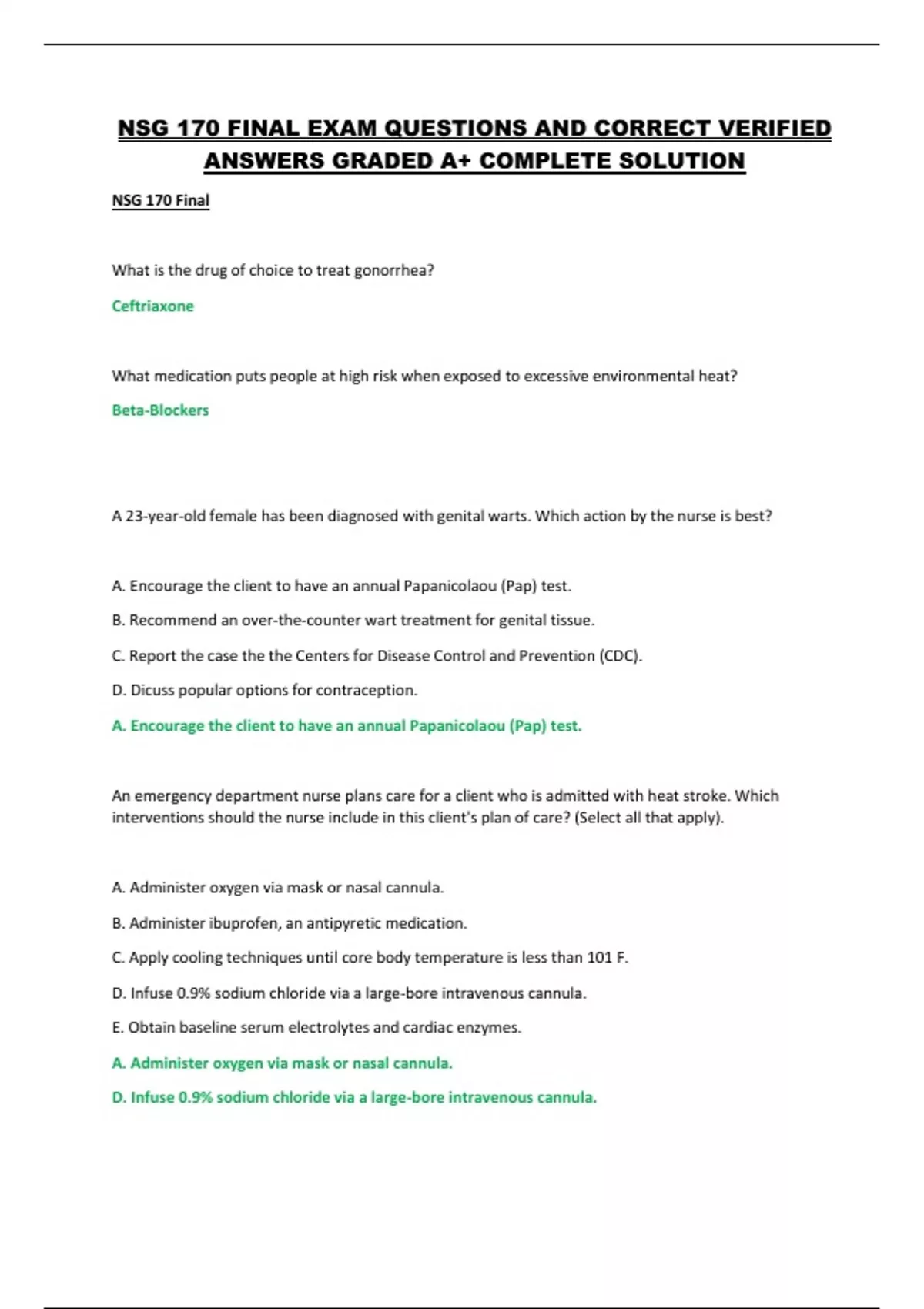 NSG 170 FINAL EXAM QUESTIONS AND CORRECT VERIFIED ANSWERS GRADED A+ COMPLETE SOLUTION