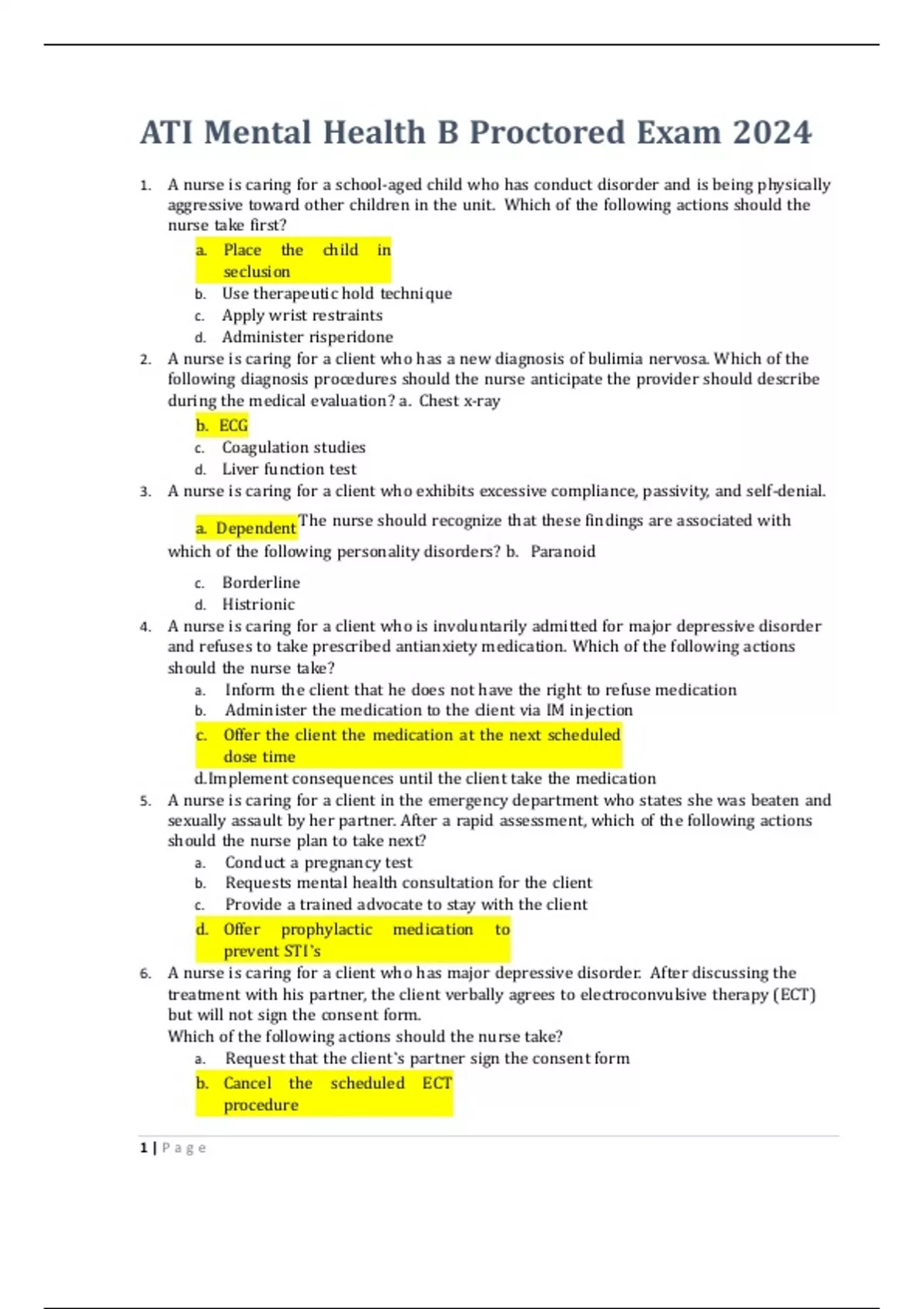 ATI Mental Health B Proctored Exam 20241. A nurse is caring for a school-aged child who has conduct disorder and is being physically aggressive toward other children in the unit. Which of the following actions should the nurse take first? a. Place the child in seclusion b. Use therapeutic hold technique c. Apply wrist restraints d. Administer risperidone 2. A nurse is caring for a client who has a new diagnosis of bulimia nervosa. Which of the following diagnosis procedures should the nurse anticipate the provider should describe during the medical evaluation? a. Chest x-ray b. ECG c. Coagulation studies d. Liver function test 3. A nurse is caring for a client who exhibits excessive compliance, passivity, and self-denial. The nurse should recognize that these findings are associated with a. Dependent which of the following personality disorders? b. Paranoid c. Borderline d. Histrionic 4. A nurse is caring for a client who is involuntarily admitted for major depressive disorder and refuses to take prescribed antianxiety medication. Which of the following actions should the nurse take? a. Inform the client that he does not have the right to refuse medication b. Administer the medication to the client via IM injection c. Offer the client the medication at the next scheduled dose time d.Implement consequences until the client take the medication 5. A nurse is caring for a client in the emergency department who states she was beaten and sexually assault by her partner. After a rapid assessment, which of the following actions should the nurse plan to take next? a. Conduct a pregnancy test b. Requests mental health consultation for the client c. Provide a trained advocate to stay with the client d. Offer prophylactic medication to prevent STI’s 6. A nurse is caring for a client who has major depressive disorder. After discussing the treatment with his partner, the client verbally agrees to electroconvulsive therapy (ECT) but will not sign the consent form. Which of the following actions should the nurse take? a. Request that the client’s partner sign the consent form b. Cancel the scheduled ECT procedure 1 | P a g ec. Proceed with the preparation for ECT based on implied consent d. Inform the client about the risks of refusing the ECT 7. A nurse is caring for a client who reports that he is angry with his partner because she thinks he is just trying to gain attention. When the nurse attempts to talk to the client, he becomes angry and tells her to leave. Which of the following defense mechanisms is the client demonstrating? a. Rationalization b. Denial c. Compensation d. Displacement 8. A nursing is advising an assistive personnel (AP) on the care of a client who has major depressive disorder. The AP states that he is irritated by the client’s depression. Which of the following statements by the nurse is appropriate? a. Please don’t take what the client said seriously when she is depressed b. It’s important that the client feel safe verbalizing how she is feeling c. Everybody feels that way about this client so don’t worry about it d. I’ll change your assignment to someone who doesn’t have depressive disorder 9. A nurse is assessing a child in the emergency department. Which of the following findings places the child at the greatest risk for physical abuse? a. The child is 10years old b. The child is homeschooled c. The has no siblings d. The child has cystic fibrosis 10. A nurse is providing behavioral therapy for a client who has obsessive-compulsive disorder. The client repeatedly checks that the doors are locked at night. Which of the following instructions should the nurse give the client when using thought stopping technique? a. Keep a journal of how often you check the locks each night b. Snap a rubber band on your wrist when you think about checking the locks c. Ask a family member to check the lock for you at night d. Focus on abdominal breathing whenever you go to check the locks 11. A nurse is assessing a client who is experiencing alcohol withdrawal. For which of the following findings should the nurse anticipate administration of lorazepam/ a. Bradycardia b. Stupor c. Afebrile d. Hypertension 12. A nurse is creating a plan of care of a client who has anorexia nervosa. Which of the following intervention should the nurse include in the plan? a. Weigh the client twice per day b. Prepare the client for electroconvulsive therapy c. Set a weight gain goal of 2.2kg (5lbs) per weekd. Encourage the client to participate in family therapy 13. A nurse is planning care for a 3-year-old child who has autism spectrum disorder. Which of the following finding should the nurse expect? a. Readily initiates conversation b. Enjoys imaginative play c. Strong relationship with sibling and peers d. Attachment to objects that spin 14. A nurse is planning care for a client who has bipolar disorder. The client reports not sleeping for 3 days and is exhibiting a euphoric mood. The nurse should identify which of the following as the priority intervention. a. Secure the client’s valuable possessions b. Limit loud noises in the client’s environment c. Encourage the client to participate in structured solitary activities d. Provide high calorie snacks to the client 15. A nurse is evaluating the medication response of a client who takes naltrexone for the treatment of alcohol use disorder. The nurse should identify that which of the following is a therapeutic effect of this medication. a. Blocks aldehyde dehydrogenase b. Prevents the anxiety of abstinence c. Reduces substance craving d.Decreases the likelihood of seizures 16. A nurse in an alcohol treatment facility is caring for a client who states “my job is so stressful that the only way I can come it is to drink.” The nurse should recognize that the client is displaying which of the following defense mechanisms? a. Repression b. Rationalization c. Introjection d. Intellectualization 17. A nurse is caring for a client who has depressio