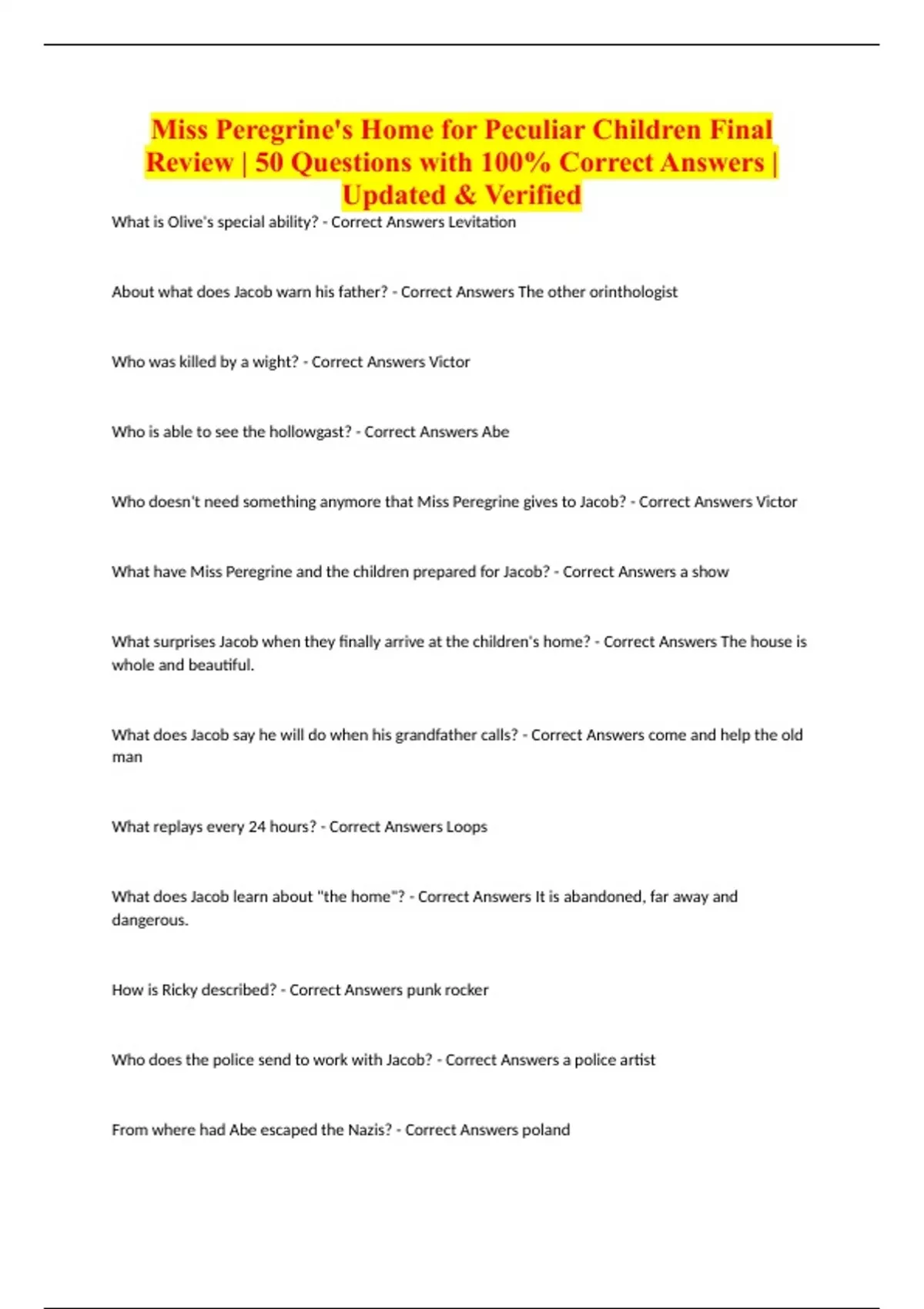 Miss Peregrine's Home for Peculiar Children Final Review | 50 Questions with 100% Correct Answers | Updated & Verified What is Olive's special ability? - Correct Answers Levitation About what does Jacob warn his father? - Correct Answers The other orinthologist Who was killed by a wight? - Correct Answers Victor Who is able to see the hollowgast? - Correct Answers Abe Who doesn't need something anymore that Miss Peregrine gives to Jacob? - Correct Answers Victor What have Miss Peregrine and the children prepared for Jacob? - Correct Answers a show What surprises Jacob when they finally arrive at the children's home? - Correct Answers The house is whole and beautiful. What does Jacob say he will do when his grandfather calls? - Correct Answers come and help the old man What replays every 24 hours? - Correct Answers Loops What does Jacob learn about "the home"? - Correct Answers It is abandoned, far away and dangerous. How is Ricky described? - Correct Answers punk rocker Who does the police send to work with Jacob? - Correct Answers a police artist From where had Abe escaped the Nazis? - Correct Answers poland Who agrees to take Jacob to the home? - Correct Answers dylan
