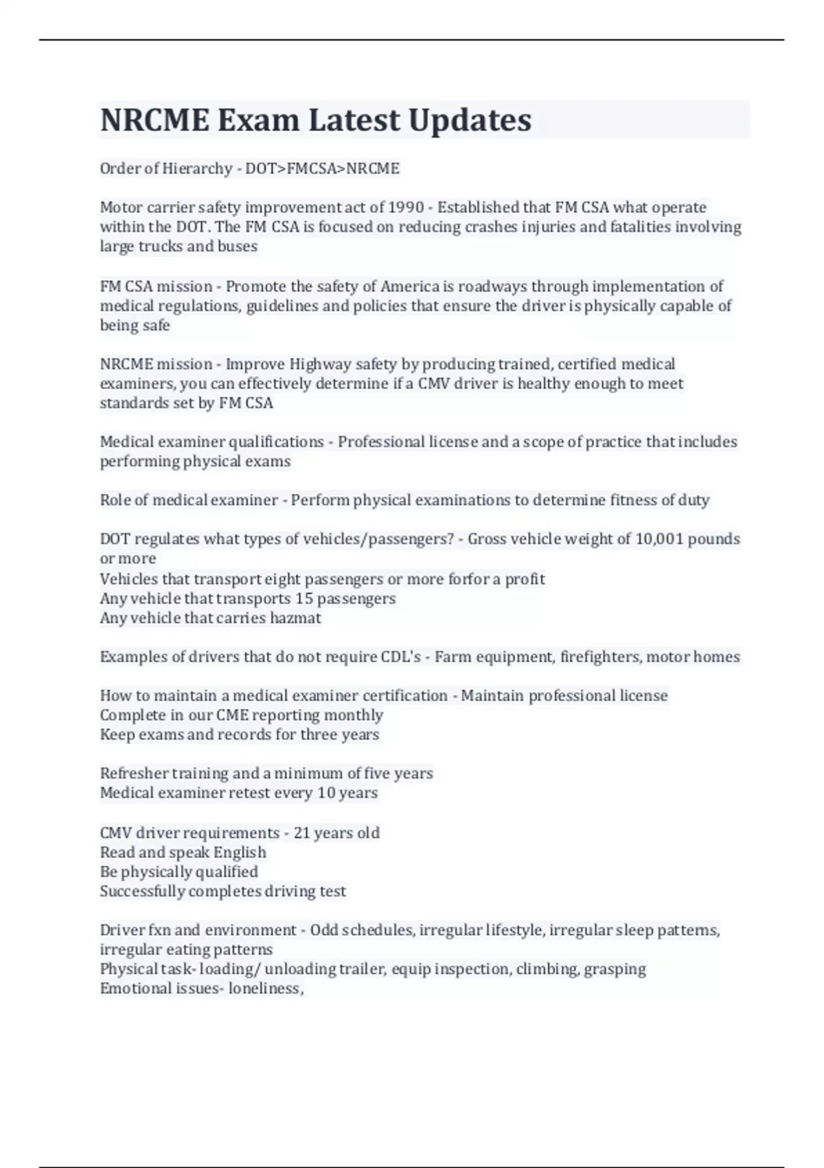 NRCME Exam Latest Updates Order of Hierarchy - DOT>FMCSA>NRCME Motor carrier safety improvement act of 1990 - Established that FM CSA what operate within the DOT. The FM CSA is focused on reducing crashes injuries and fatalities involving large trucks and buses FM CSA mission - Promote the safety of America is roadways through implementation of medical regulations, guidelines and policies that ensure the driver is physically capable of being safe NRCME mission - Improve Highway safety by producing trained, certified medical examiners, you can effectively determine if a CMV driver is healthy enough to meet standards set by FM CSA Medical examiner qualifications - Professional license and a scope of practice that includes performing physical exams Role of medical examiner - Perform physical examinations to determine fitness of duty DOT regulates what types of vehicles/passengers? - Gross vehicle weight of 10,001 pounds or more Vehicles that transport eight passengers or more forfor a profit Any vehicle that transports 15 passengers Any vehicle that carries hazmat Examples of drivers that do not require CDL's - Farm equipment, firefighters, motor homes How to maintain a medical examiner certification - Maintain professional license Complete in our CME reporting monthly Keep exams and records for three years Refresher training and a minimum of five years Medical examiner retest every 10 years CMV driver requirements - 21 years old Read and speak English Be physically qualified Successfully completes driving test Driver fxn and environment - Odd schedules, irregular lifestyle, irregular sleep patterns, irregular eating patterns Physical task- loading/ unloading trailer, equip inspection, climbing, grasping Emotional issues- loneliness, Average CMV DRIVER - Male >40 yo Sedentary Overweight Smoker Poor diet >2 medical conditions CVD hx Less healthy than average Driver demands - Alert Mobility of neck and vision to see mirrors Mobility in arms for steering wheel Vision and dexterity for complex dash Stamina, flexibility, ROM CMV UNIQUES STRESSORS - route changes, traffic, weather, tight schedules, cargo: people, HAZMAT Purpose of physical exam - TO DETERMINE MEDICAL FITNESS FOR DUTY obligation is to establish if there is a condition that can potentiate public endangerment to include safely operating a vehicle, sudden death risk and gradual incapacitation. Do not do or tx