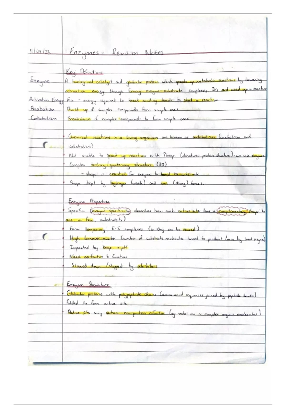 Summary A Level Biology- Enzymes