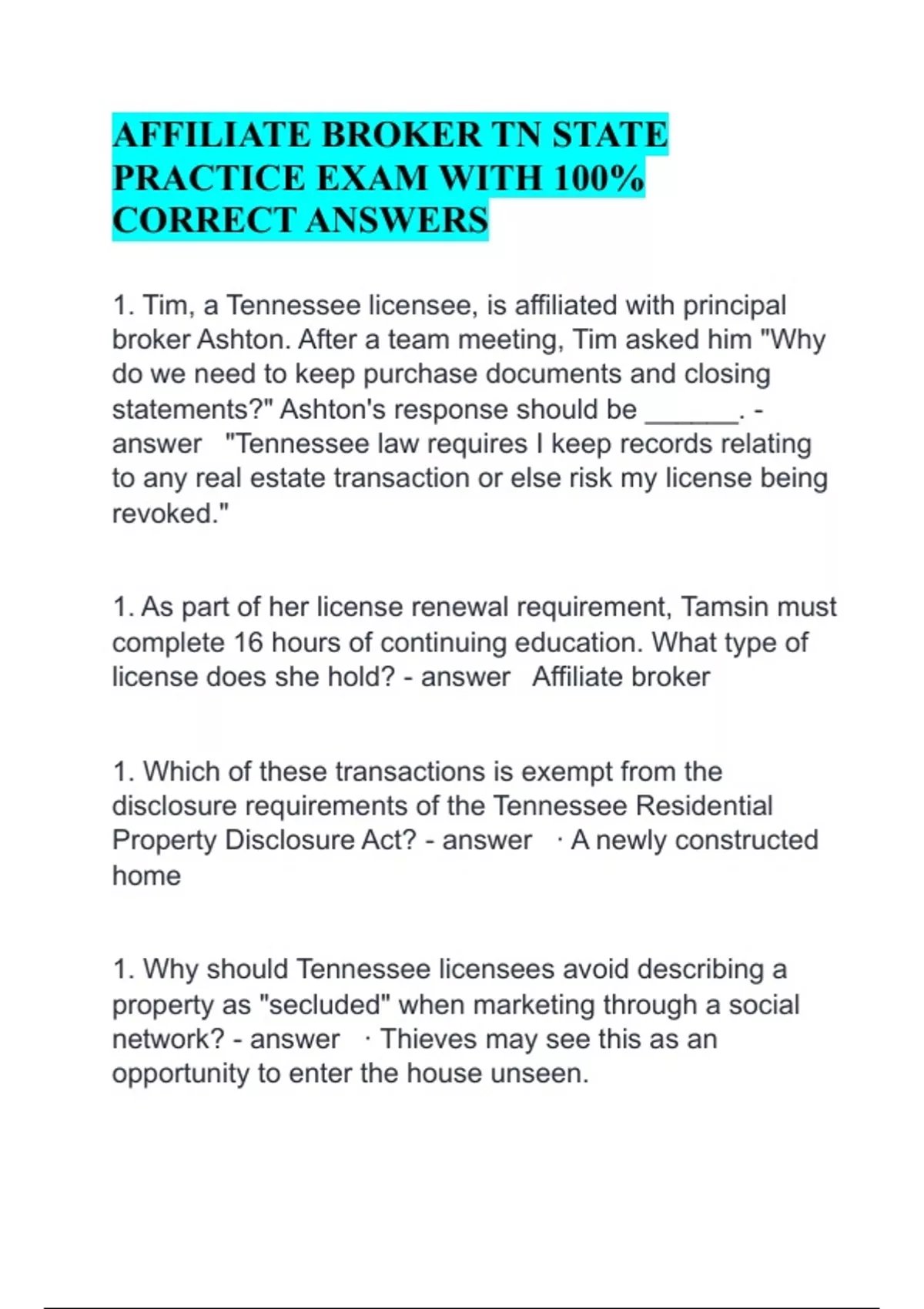 AFFILIATE BROKER TN STATE PRACTICE EXAM WITH 100% CORRECT ANSWERS