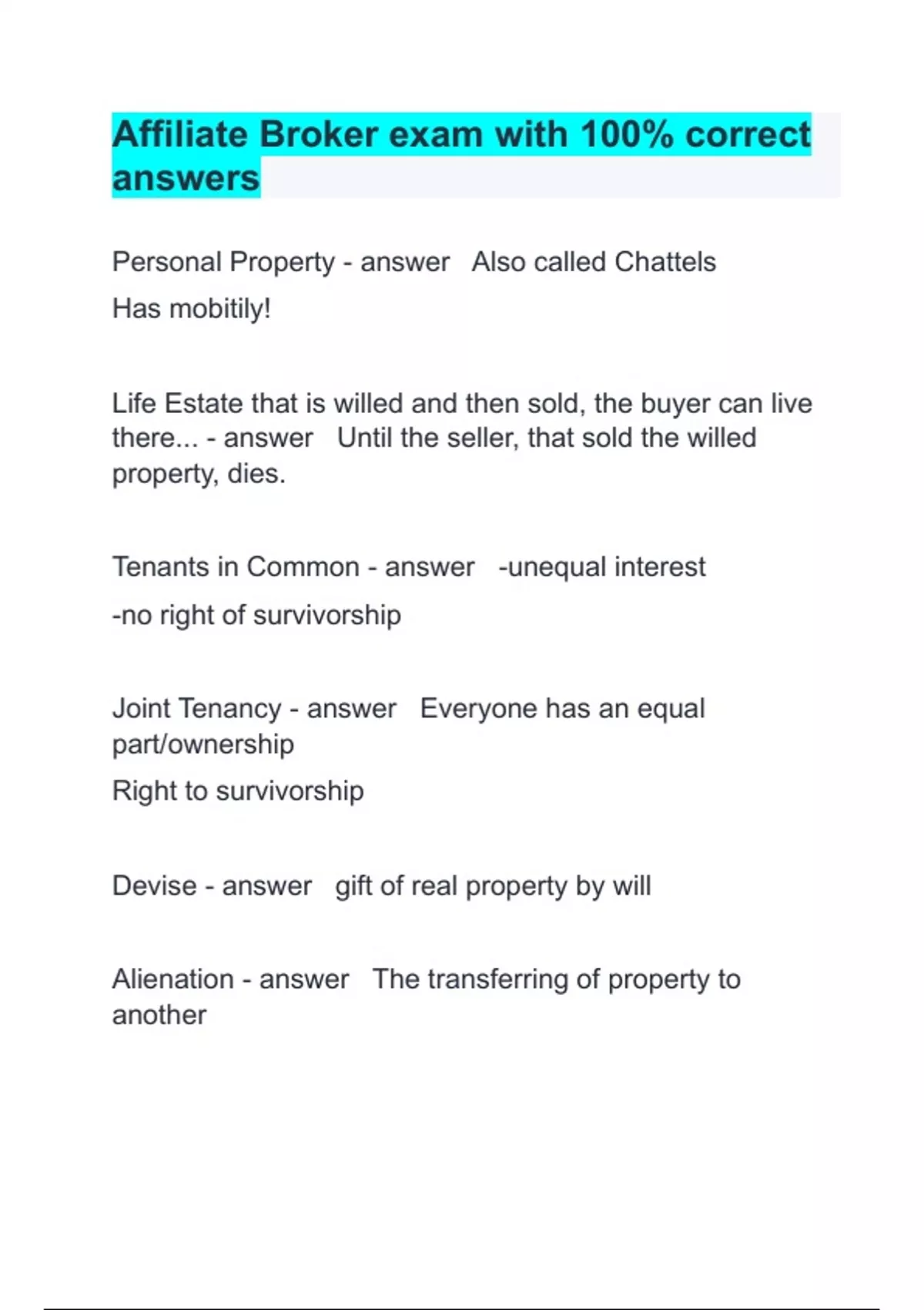 Personal Property Also called Chattels Has mobitily! Life Estate that is willed and then sold, the buyer can live there... Until the seller, that sold the willed property, dies. Tenants in Common -unequal interest -no right of survivorship Joint Tenancy Everyone has an equal part/ownership Right to survivorship Devise gift of real property by will Alienation The transferring of property to another Encroachment A building or some portion of it - a wall or fence for instance - that extends beyond the land of the owner and illegally intrudes on some land of an adjoining owner or a street or alley Accession right to all which one's property produces; acquiring property attached as an incident. Process of acquiring title to improvements made on your land without your approval before installation. Accretion addition of land by the deposit of sand or soil by a natural process. Alluvion solid material deposited by a body of water Erosion gradual wearing away of land by wind or water Avulsion The sudden tearing away of land, as by earthquake, flood, volcanic action, or the sudden change in the course of a stream. Intestate vs Testate Intestate means a person dies with no will and testate means the person who died had a valid will. Escheat the reversion of property to the government when someone dies who has no will or heirs General Warranty Deed Contains all covenants but is only as good as the seller is. Purchase title insurance Special Warranty Deed Contains what it has to and nothing extra. No special promises. Quitclaim Deed deed that conveys an individual's property rights to another but has none of the covenants of the warranty deed Fiduciary Responsibilities obedience, loyalty, disclosure, confidentiality Non-Conforming Use ("Grandfather Clause") existed before zoning, can continue to exist after zoning. Designated Agent A licensee authorized by a broker to act as the agent for a specific person in a particular transaction. Transaction Broker/ Facilitator A non-agency represents no one as agent in a real estate transaction. Constructive Notice When a deed is recorded Material Facts conditions or anything that could/would cause you to not buy the property. Exclusive Agency owner reserves right to sell without paying anyone commission if he sales to a prospect who was not introduced or claimed by the broker. Voidable Contract A contract that seems to be valid on the surface but may be rejected or disaffirmed by one or both of the parties. Executed Contract A contract under which both parties have fulfilled their promises and perform the contract. Equitable Title gives buyer the right to force the seller to sale if the seller attempts to wessell out of the contract. This requires court action, called a suit of specific performance. Uniform Vendor and Purchaser Risk Act (UVPRA) seller is responsible for the property as it is under contract. *In case of flood/fires* TN HAS NOT PASSED!! IT IS ALREADY IN THE CONTRACT IN A CLAUSE Option Contract a contract that gives the purchaser of the option the right to buy property at a fixed price for a certain period of time. OWNER IS OBLIGATED TO SALE! Fee Simple Estate The maximum possible estate or right of ownership of real property. Indefeasible. Has something you can will to someone else Determinable Estate/ Defeasible Estate an estate thats subject to a special limitation or condition. If limitation or condition is violated, original grantor automatically reacquires full ownership Remainderman Person who receives title to property after the life tenant dies. Receives a fee simple abso