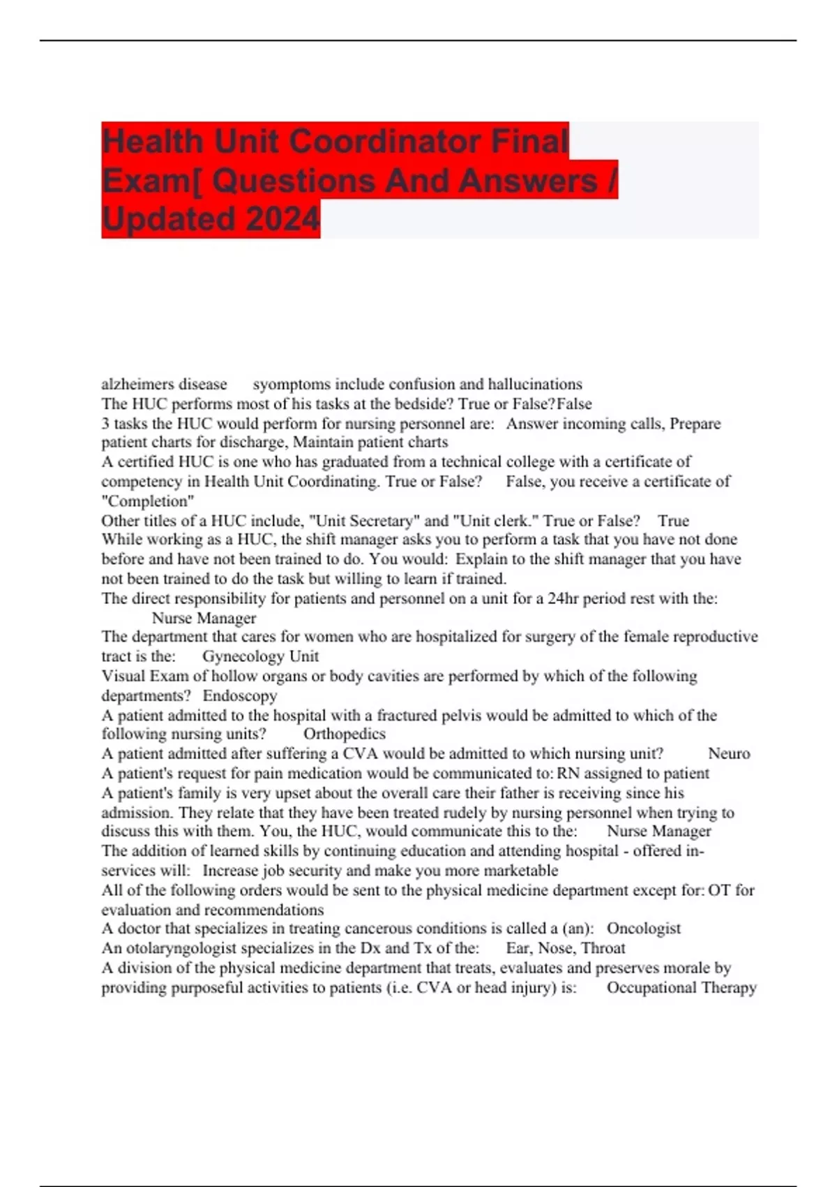 Health Unit Coordinator Final Exam[ Questions And Answers / Updated 2024 alzheimers disease syomptoms include confusion and hallucinations The HUC performs most of his tasks at the bedside? True or False? False 3 tasks the HUC would perform for nursing personnel are: Answer incoming calls, Prepare patient charts for discharge, Maintain patient charts A certified HUC is one who has graduated from a technical college with a certificate of competency in Health Unit Coordinating. True or False? False, you receive a certificate of "Completion" Other titles of a HUC include, "Unit Secretary" and "Unit clerk." True or False? True While working as a HUC, the shift manager asks you to perform a task that you have not done before and have not been trained to do. You would: Explain to the shift manager that you have not been trained to do the task but willing to learn if trained. The direct responsibility for patients and personnel on a unit for a 24hr period rest with the: Nurse Manager The department that cares for women who are hospitalized for surgery of the female reproductive tract is the: Gynecology Unit Visual Exam of hollow organs or body cavities are performed by which of the following departments? Endoscopy A patient admitted to the hospital with a fractured pelvis would be admitted to which of the following nursing units? Orthopedics A patient admitted after suffering a CVA would be admitted to which nursing unit? Neuro A patient's request for pain medication would be communicated to: RN assigned to patient A patient's family is very upset about the overall care their father is receiving since his admission. They relate that they have been treated rudely by nursing personnel when trying to discuss this with them. You, the HUC, would communicate this to the: Nurse Manager The addition of learned skills by continuing education and attending hospital - offered in-services will: Increase job security and make you more marketable All of the following orders would be sent to the physical medicine department except for: OT for evaluation and recommendations A doctor that specializes in treating cancerous conditions is called a (an): Oncologist An otolaryngologist specializes in the Dx and Tx of the: Ear, Nose, Throat A division of the physical medicine department that treats, evaluates and preserves morale by providing purposeful activities to patients (i.e. CVA or head injury) is: Occupational Therapy Acknowledgement that a hospital has met certain official standards is called: Accreditation The term usually applied to the physician who admits and has ultimate responsibility for the patient while hospitalized is the: Attending Physician An Opthamologist treats diseases of the ear and nose? True or False? False, they treat the eyes Pathologist: Studies alterations of the body caused by disease Urologist: Treats diseases of the male reproductive tract Proctologist: Treats diseases of the rectum Geriatrist: Studies and treats diseases of the aged A patient receiving liquid nutrient through an artificial opening in the stomach wall is receiving a/an: Gastrostomy feeding A doctor's order reading "NPO MN" means: Nothing by mouth after midnight Diets that are called special or therapeutic are: Soft, Low residue, Low Na, 1000 cal ADA A doctor's order "DAT" would require the HUC to check with the nurse for specific diet to order. True or False? True Diets that may be ordered by the nurse for a patient who may have "diet as tolerated" are: Clear liquid diet, full liquid, soft and general A patient ordered "sips and chips" may have sips of: Water and ice chips A new doctor's order for "2.5 gm Na" would cancel a previous order for a soft diet. True or False? True A patient admitted with an "NPO" order would require the HUC to send that information to the dietary department. True or False? True A patient with an order of "sips and chips" would not require the HUC to send that information to the dietary department. True or False? False A test that will be ordered from the pulmonary function department is: ABG The hospital cardiovascular diagnostics department performs a study referred to as: EKG The HUC may schedule a sigmoidoscopy in the endoscopy department. True or False? True The neurodiagnostics department performs a diagnostic procedure known as a / an: EEG ECG and EKG are both abbreviations for electrocardiogram. True or False? True The abbreviation LOC following EKG on a doctor's order means: The tracing is to be placed in the chart for the doctor to read When the abbreviation RA appears after ABG, it means the patient should not be receiving O2 for a time prior to or when the blood is drawn. True or False? True An electroencephalogram is a graph produced during a diagnostic procedure to study what? Brain Function Cardiac catheterization is considered an invasion diagnositc procedure to study. True or False? True Which of the following medications would need to be noted when ordering an EKG? Lanoxin