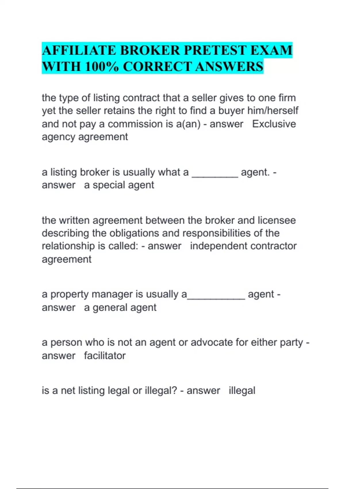 Affiliate Broker pretest exam with 100% correct answers