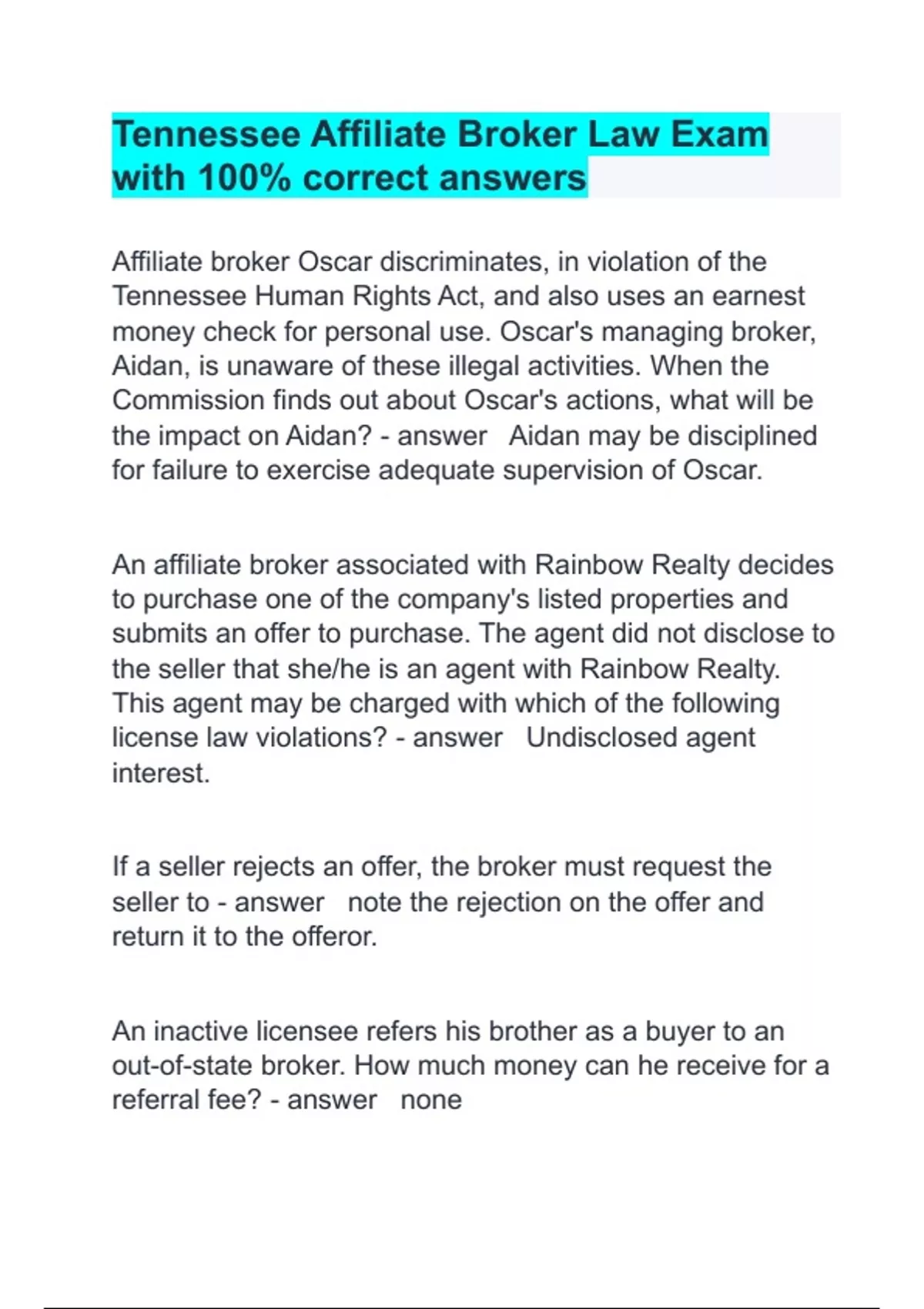 Tennessee Affiliate Broker Law Exam exam with 100% correct answers