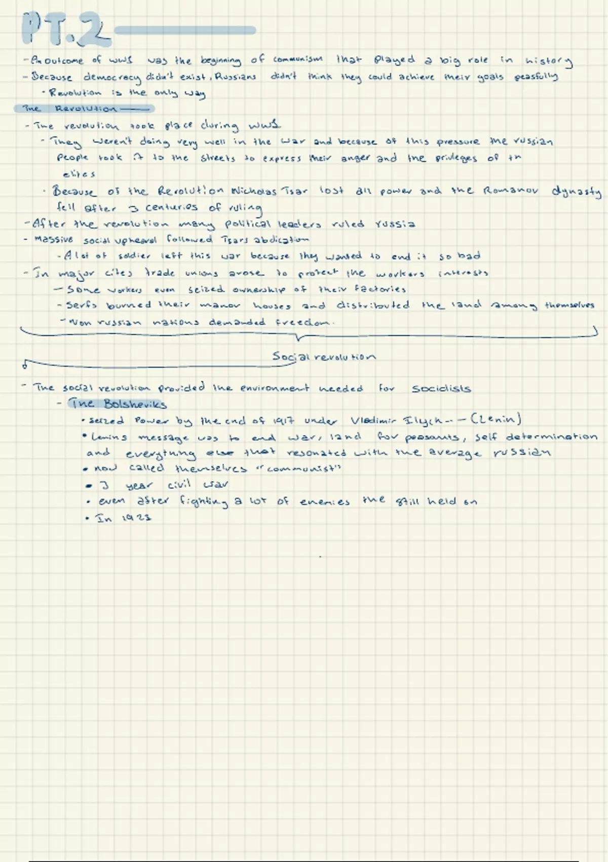 these notes are about the Russian revolution. it talks about the Russian Industrial Revolution and how the Bolsheviks came into power. it is hand written and contain a data table laying everything out for a simpler veiw
