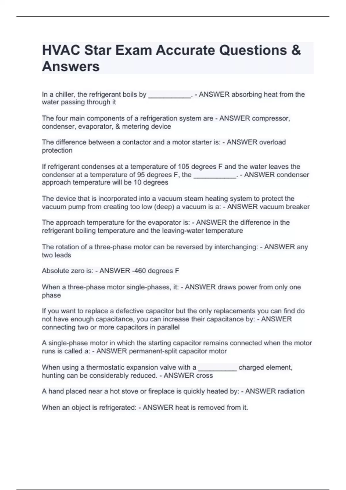 HVAC Star Exam Accurate Questions & AnswersIn a chiller, the refrigerant boils by ___________. - ANSWER absorbing heat from the water passing through it The four main components of a refrigeration system are - ANSWER compressor, condenser, evaporator, & metering device The difference between a contactor and a motor starter is: - ANSWER overload protection If refrigerant condenses at a temperature of 105 degrees F and the water leaves the condenser at a temperature of 95 degrees F, the ___________. - ANSWER condenser approach temperature will be 10 degrees The device that is incorporated into a vacuum steam heating system to protect the vacuum pump from creating too low (deep) a vacuum is a: - ANSWER vacuum breaker The approach temperature for the evaporator is: - ANSWER the difference in the refrigerant boiling temperature and the leaving-water temperature The rotation of a three-phase motor can be reversed by interchanging: - ANSWER any two leads Absolute zero is: - ANSWER -460 degrees F When a three-phase motor single-phases, it: - ANSWER draws power from only one phase If you want to replace a defective capacitor but the only replacements you can find do not have enough capacitance, you can increase their capacitance by: - ANSWER connecting two or more capacitors in parallel