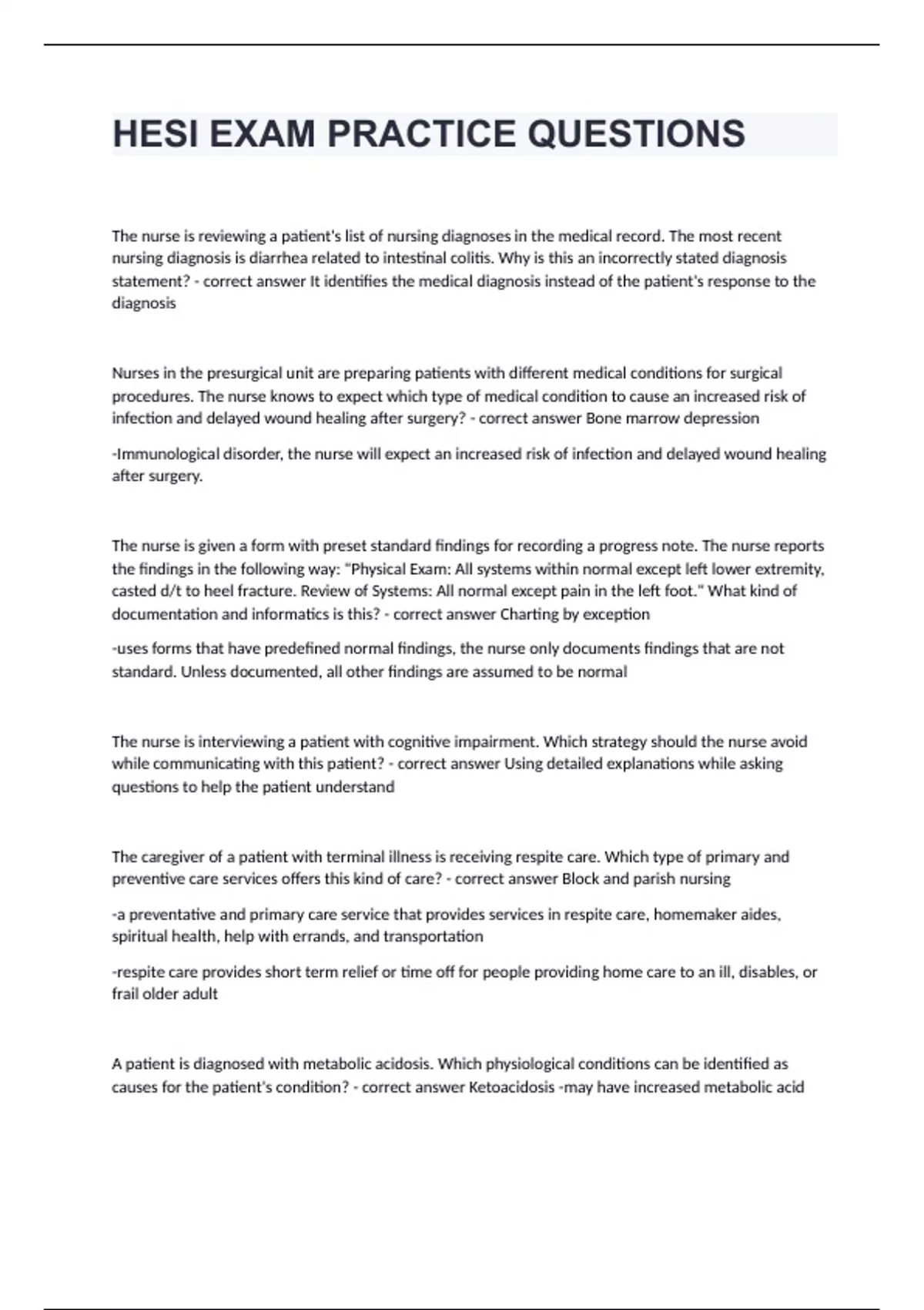 HESI EXAM PRACTICE QUESTIONSThe nurse is reviewing a patient's list of nursing diagnoses in the medical record. The most recent nursing diagnosis is diarrhea related to intestinal colitis. Why is this an incorrectly stated diagnosis statement? - correct answer It identifies the medical diagnosis instead of the patient's response to the diagnosis Nurses in the presurgical unit are preparing patients with different medical conditions for surgical procedures. The nurse knows to expect which type of medical condition to cause an increased risk of infection and delayed wound healing after surgery? - correct answer Bone marrow depression -Immunological disorder, the nurse will expect an increased risk of infection and delayed wound healing after surgery. The nurse is given a form with preset standard findings for recording a progress note. The nurse reports the findings in the following way: "Physical Exam: All systems within normal except left lower extremity, casted d/t to heel fracture. Review of Systems: All normal except pain in the left foot." What kind of documentation and informatics is this? - correct answer Charting by exception -uses forms that have predefined normal findings, the nurse only documents findings that are not standard. Unless documented, all other findings are assumed to be normal The nurse is interviewing a patient with cognitive impairment. Which strategy should the nurse avoid while communicating with this patient? - correct answer Using detailed explanations while asking questions to help the patient understand The caregiver of a patient with terminal illness is receiving respite care. Which type of primary and preventive care services offers this kind of care? - correct answer Block and parish nursing -a preventative and primary care service that provides services in respite care, homemaker aides, spiritual health, help with errands, and transportation -respite care provides short term relief or time off for people providing home care to an ill, disables, or frail older adult A patient is diagnosed with metabolic acidosis. Which physiological conditions can be identified as causes for the patient's condition? - correct answer Ketoacidosis -may have increased metabolic acid