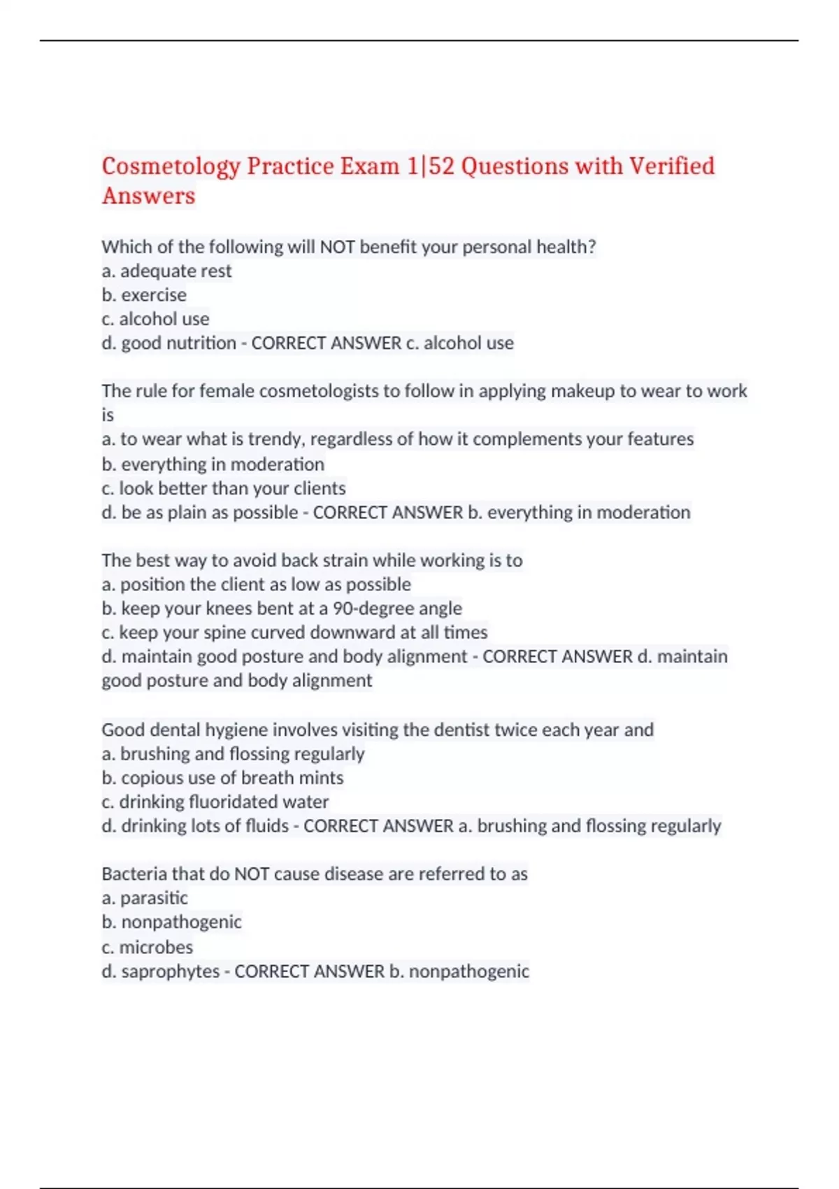 Cosmetology Practice Exam 1|52 Questions with Verified Answers Which of the following will NOT benefit your personal health? a. adequate rest b. exercise c. alcohol use d. good nutrition - CORRECT ANSWER c. alcohol use The rule for female cosmetologists to follow in applying makeup to wear to work is a. to wear what is trendy, regardless of how it complements your features b. everything in moderation c. look better than your clients d. be as plain as possible - CORRECT ANSWER b. everything in moderation The best way to avoid back strain while working is to a. position the client as low as possible b. keep your knees bent at a 90-degree angle c. keep your spine curved downward at all times d. maintain good posture and body alignment - CORRECT ANSWER d. maintain good posture and body alignment Good dental hygiene involves visiting the dentist twice each year and a. brushing and flossing regularly b. copious use of breath mints c. drinking fluoridated water d. drinking lots of fluids - CORRECT ANSWER a. brushing and flossing regularly Bacteria that do NOT cause disease are referred to as a. parasitic b. nonpathogenic c. microbes d. saprophytes - CORRECT ANSWER b. nonpathogenic Disease-causing bacteria can be spread by a. touching bacterial spores b. getting wet or cold c. cleaning with disinfectants d. coughing or spitting - CORRECT ANSWER d. coughing or spitting Which of the following is a contagious skin disease caused by a fungus? a. scabies b. tuberculosis c. ringworm d. AIDS - CORRECT ANSWER c. ringworm The method of cleaning instruments that kills all microorganisms, including bacterial spores, is a. decontamination b. sanitation c. sterilization d. washing - CORRECT ANSWER c. sterilization Antiseptics differ from disinfectants because they a. kill bacterial spores b. can be used without government authorization c. are safe to use on skin d. require a prescription from a physician - CORRECT ANSWER c. are safe to use on skin Salon sanitation is important to prevent the spread of disease as well as to a. make your work more efficient b. command higher prices for services c. make a good impression on clients - CORRECT ANSWER a. make your work more efficient When using disinfectants, you should remember that they a. kill all dangerous germs on contact b. cannot reach germs hidden in nooks and crannies c. can be dangerous if used incorrectly d. are inexpensive and, therefore, should be used liberally - CORRECT ANSWER c. can be dangerous if used incorrectly Trichology is the study of a. hair b. beauty c. magic d. color - CORRECT ANSWER a. hair Name the two distinct phases of the life cycle of bacteria a. preliminary and complete b. vegetative and spore-forming c. fast and slow d. infectious and noninfectious - CORRECT ANSWER d. infectious and noninfectious Seen in cross section, straight hair would appear to be a. round b. oval c. almost flat d. completely flat - CORRECT ANSWER b. oval Your client has a bad case of dry dandruff. You should suggest a. treatment by a doctor b. infrequent shampooing with regular soap c. scalp treatments and frequent mild shampoos d. ultraviolet treatments to the scalp - CORRECT ANSWER a. treatment by a doctor Alopecia areata occurs when the client's hair a. suddenly falls out in round patches b. changes from oily to very dry c. produces excessive amounts of sebum d. turns gray very suddenly - CORRECT ANSWER a. suddenly falls out in round patches The visible portion of the nail itself is referred to as the a. nail plate b. nail bed c. free edge d. root - CORRECT ANSWER a. nail plate A hangnail can be caused by a. cutting the cuticle improperly b. too many hot-oil manicures c. injury to the nail bed d. fungus or bacterial infection - CORRECT ANSWER a. cutting the cuticle improperly One way to reassure your client about the cleanliness of your nail care equipment is to a. tell them that all instruments are sterilized after each use b. keep your instruments in sterilizing equipment when not in use c. tell them that no one has ever gotten an infection in your salon d. keep metal, wood, and plastic implements seperate from each other - CORRECT ANSWER b. keep your instruments in sterilizing equipment when not in use The outermost and thinnest layer of the skin is the a. dermis b. epidermis c. papillary layer d. subcutaneous tissue - CORRECT ANSWER d. subcutaneous tissue The study of the skin and its diseases and treatment is referred to as a. dermatology b. histology c. pathology d. trichology - CORRECT ANSWER a. dermatology A steatoma, or sebaceous cyst, is a. a chronic inflammation on the nose and cheeks b. a subcutaneous tumor of a sebaceous gland c. an accumulation of sebaceous matter beneath the skin d. a contagious disease of the sebaceous glands - CORRECT ANSWER c. an accumulation of sebaceous matter beneath the skin The part of a cell that contains the genetic information is the a. nucleus b. protoplasm c. cytoplasm d. membrane - CORRECT ANSWER a. nucleus A pimple or abscess is a a. local infection b. general infection c. toxic infection d. nontoxic infection - CORRECT ANSWER a. local infection Which of the following lives only by penetrating cells and becoming part of them? a. virus b. bacteria c. organisms d. amoebas - CORRECT ANSWER a. virus The main function of the blood is to a. add color to the face and lips b. provide structure and support to body systems c. carry food and oxygen and eliminate wastes d. provide fluid to all the body tissues - CORRECT ANSWER c. carry food and oxygen and eliminate wastes Which of the following substances will NOT conduct electricity? a. the human body b. silver c. glass d. copper - CORRECT ANSWER c. glass Indirect application of high-frequency current means that you a. hold one electrode and the client holds the other b. hold the electrode while the client massages the treatment area c. hold the electrode while massaging the client d. massage the area to be treated while the client holds the electrode - CORRECT ANSWER a.