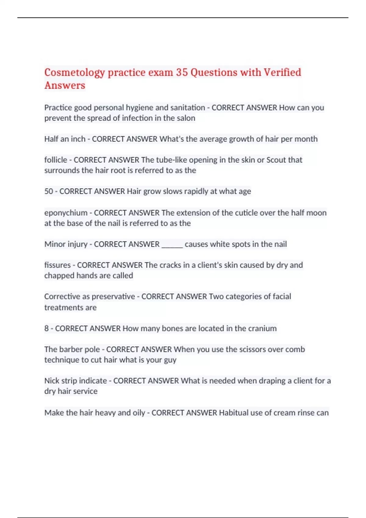 Cosmetology practice exam 35 Questions with Verified Answers Practice good personal hygiene and sanitation - CORRECT ANSWER How can you prevent the spread of infection in the salon Half an inch - CORRECT ANSWER What's the average growth of hair per month follicle - CORRECT ANSWER The tube-like opening in the skin or Scout that surrounds the hair root is referred to as the 50 - CORRECT ANSWER Hair grow slows rapidly at what age eponychium - CORRECT ANSWER The extension of the cuticle over the half moon at the base of the nail is referred to as the Minor injury - CORRECT ANSWER _____ causes white spots in the nail fissures - CORRECT ANSWER The cracks in a client's skin caused by dry and chapped hands are called Corrective as preservative - CORRECT ANSWER Two categories of facial treatments are 8 - CORRECT ANSWER How many bones are located in the cranium The barber pole - CORRECT ANSWER When you use the scissors over comb technique to cut hair what is your guy Nick strip indicate - CORRECT ANSWER What is needed when draping a client for a dry hair service Make the hair heavy and oily - CORRECT ANSWER Habitual use of cream rinse can Discuss what shape they're calling it desires - CORRECT ANSWER Before shaping a client's Nails you should Avoid touching the nail after the a acrylic primer is applied - CORRECT ANSWER How can you prevent a fungal infection from growing underneath a sculptured nail Effleurage - CORRECT ANSWER The massage movement described as a light continuous stroking movement is Texturing - CORRECT ANSWER The process of removing book from here without removing them is called Stem - CORRECT ANSWER Which part of the curl gives Direction and movement Full stem curl - CORRECT ANSWER Which one of the following types of pin curls gives the most Mobility Off base - CORRECT ANSWER Enroll replacement which base give the least amount of volume 1 inch - CORRECT ANSWER Extensions should be attached at what distance from the front hairline sides and neck Track and sew method - CORRECT ANSWER In which method are hair extension secure at the base of the clients only here by sewing Six to eight weeks - CORRECT ANSWER Semi-permanent individual eyelashes also quite a bit last approximately Remove residue that might prevent the waving lotion from penetrating - CORRECT ANSWER The purpose of pre perm shampoo is to On relaxed hair - CORRECT ANSWER When would you not perform thermal hiring Adjust the heads pH - CORRECT ANSWER The purpose of a finishing rinse after coloring hair with a lightening and toner is a close the cuticles and too 5 to 20 minutes at room temperature - CORRECT ANSWER When applying a pre softener the correct position is to produce 4 Chanukah make fine hair appear thicker and more lustrous - CORRECT ANSWER Which statement about the effect of Henna on the hair is correct Toner - CORRECT ANSWER A pastel color that is applied only after prelightening is a Warm - CORRECT ANSWER What water temperature should be used when rinsing the relaxer out of a client's hair Cutting a strand of hair straight across - CORRECT ANSWER When you performing a blunt cut your hair The amount of movement in the hair - CORRECT ANSWER What is hair texture The general quality and feel of the hair - CORRECT ANSWER What is the wave pattern Full and half - CORRECT ANSWER A hairstyle for a client with a pear shaped face should be Off bass curl - CORRECT ANSWER Which type of curl has only slight lift or volume From the scalp towards the hair ends. - CORRECT ANSWER Darren blow dryer hot air is directly