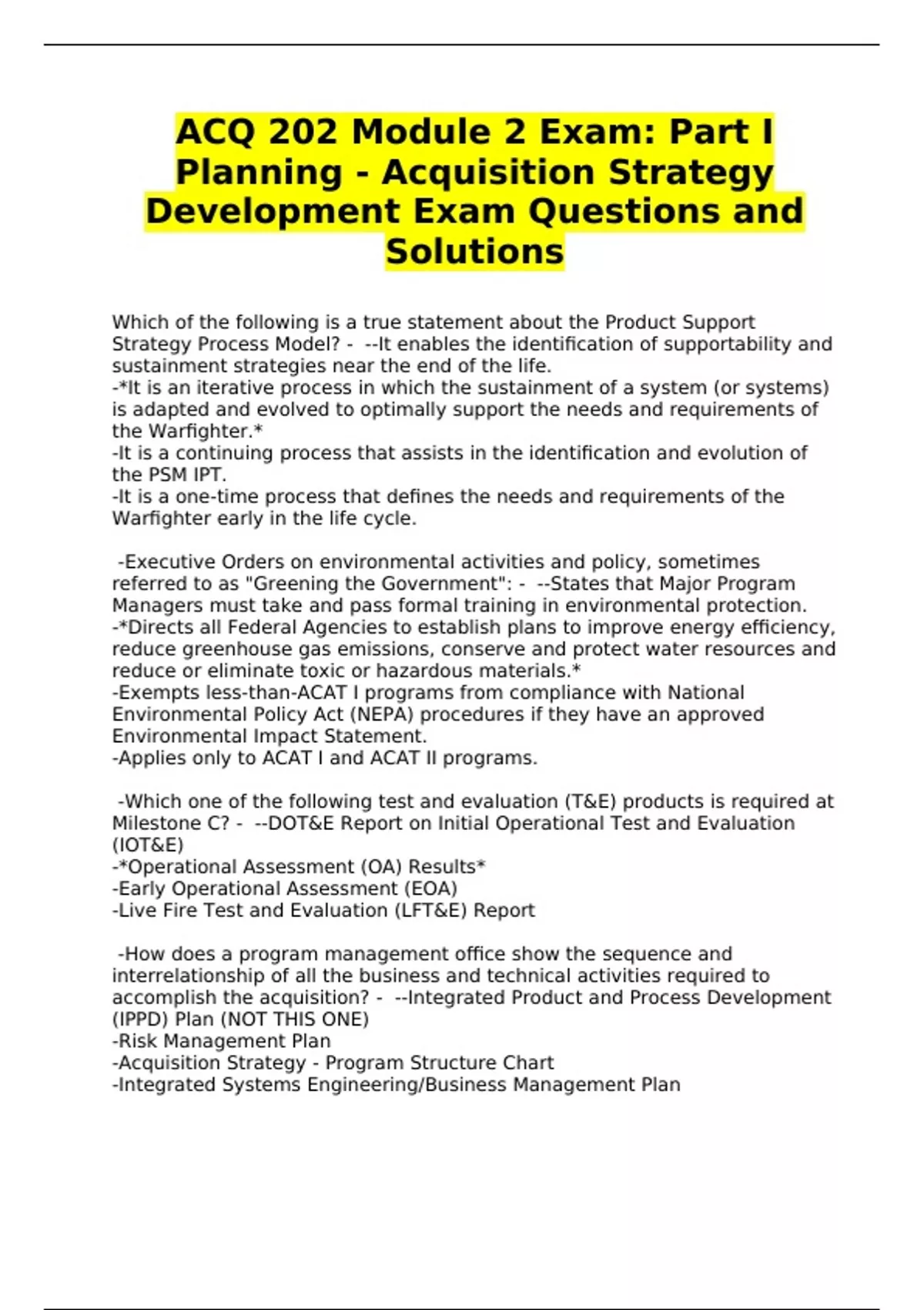 ACQ 202 Module 2 Exam: Part I Planning - Acquisition Strategy Development Exam Questions and Solutions