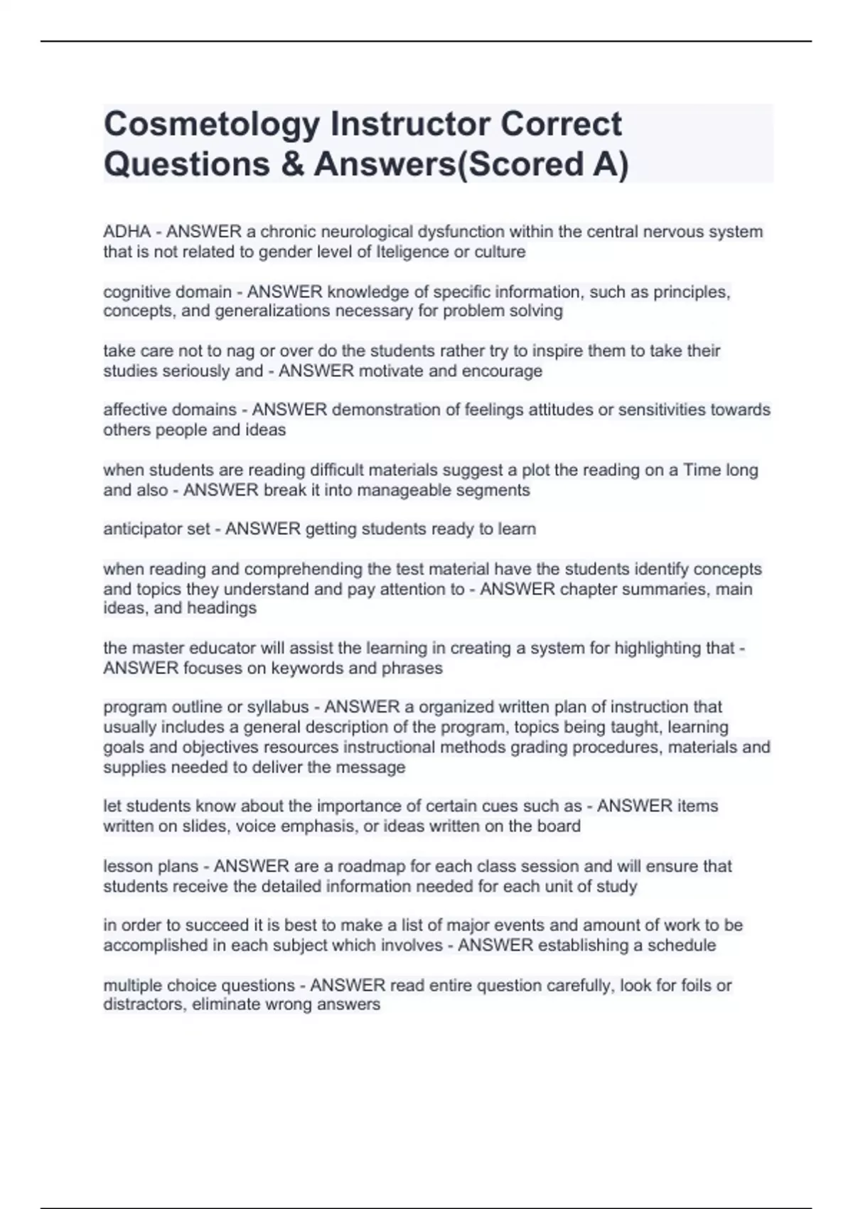 Cosmetology Instructor Correct Questions & Answers(Scored A)