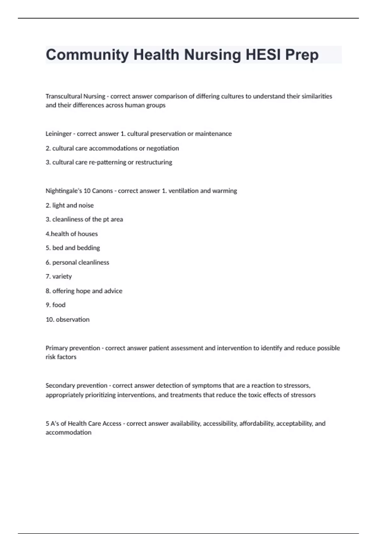 Community Health Nursing HESI Prep Transcultural Nursing - correct answer comparison of differing cultures to understand their similarities and their differences across human groups Leininger - correct answer 1. cultural preservation or maintenance 2. cultural care accommodations or negotiation 3. cultural care re-patterning or restructuring Nightingale's 10 Canons - correct answer 1. ventilation and warming 2. light and noise 3. cleanliness of the pt area h of houses 5. bed and bedding 6. personal cleanliness 7. variety 8. offering hope and advice 9. food 10. observation Primary prevention - correct answer patient assessment and intervention to identify and reduce possible risk factors Secondary prevention - correct answer detection of symptoms that are a reaction to stressors, appropriately prioritizing interventions, and treatments that reduce the toxic effects of stressors 5 A's of Health Care Access - correct answer availability, accessibility, affordability, acceptability, and accommodation