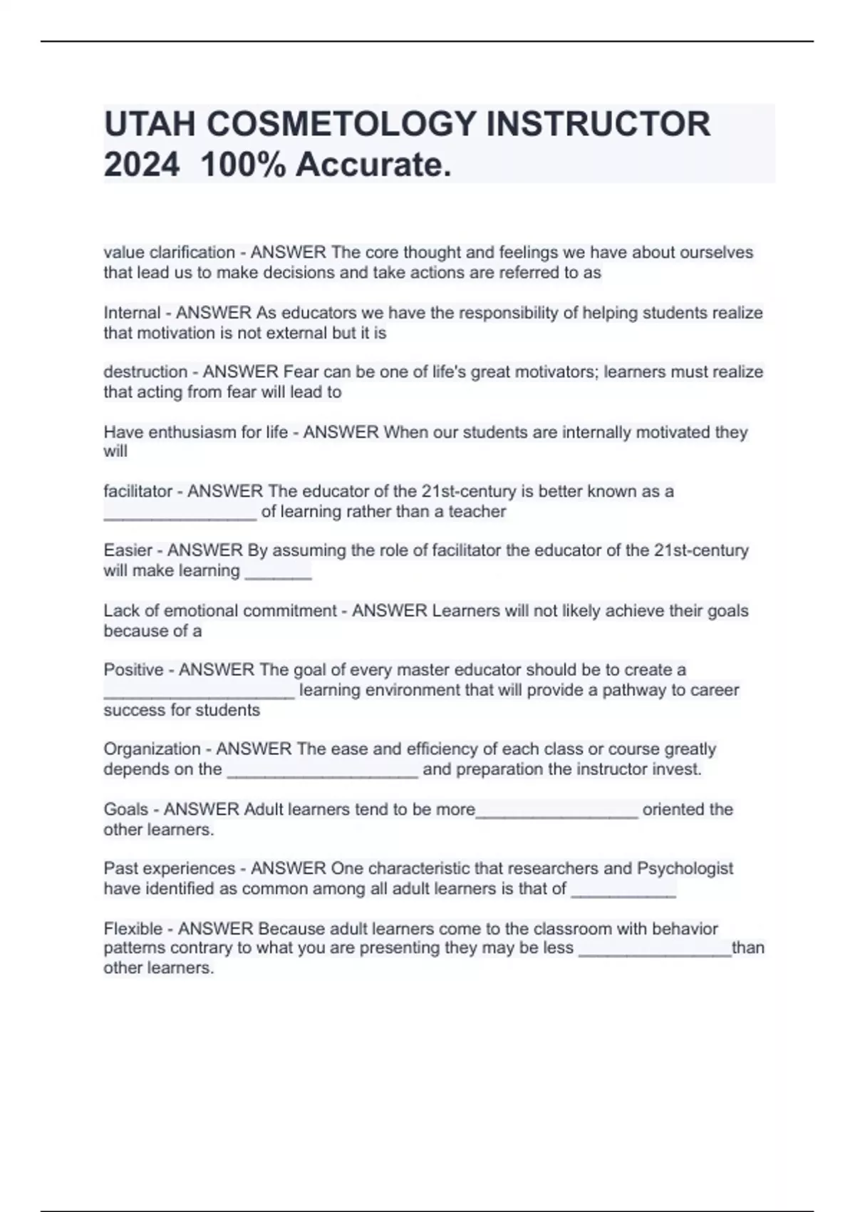 value clarification - ANSWER The core thought and feelings we have about ourselves that lead us to make decisions and take actions are referred to as Internal - ANSWER As educators we have the responsibility of helping students realize that motivation is not external but it is destruction - ANSWER Fear can be one of life's great motivators; learners must realize that acting from fear will lead to Have enthusiasm for life - ANSWER When our students are internally motivated they will facilitator - ANSWER The educator of the 21st-century is better known as a ________________ of learning rather than a teacher Easier - ANSWER By assuming the role of facilitator the educator of the 21st-century will make learning _______ Lack of emotional commitment - ANSWER Learners will not likely achieve their goals because of a Positive - ANSWER The goal of every master educator should be to create a ____________________ learning environment that will provide a pathway to career success for students Organization - ANSWER The ease and efficiency of each class or course greatly depends on the ____________________ and preparation the instructor invest. Goals - ANSWER Adult learners tend to be more_________________ oriented the other learners. Past experiences - ANSWER One characteristic that researchers and Psychologist have identified as common among all adult learners is that of ___________ Flexible - ANSWER Because adult learners come to the classroom with behavior patterns contrary to what you are presenting they may be less ________________than other learners. Make connections - ANSWER Adult learners tend to___________________________ with information or knowledge they already have. reaction - ANSWER Master educators will challenge adult learners to think and incite _______________________ on the part of the learner to what is taking place in the classroom retention - ANSWER Relating as much of the education as possible to the students unique interest will increase learners commitment and ______________