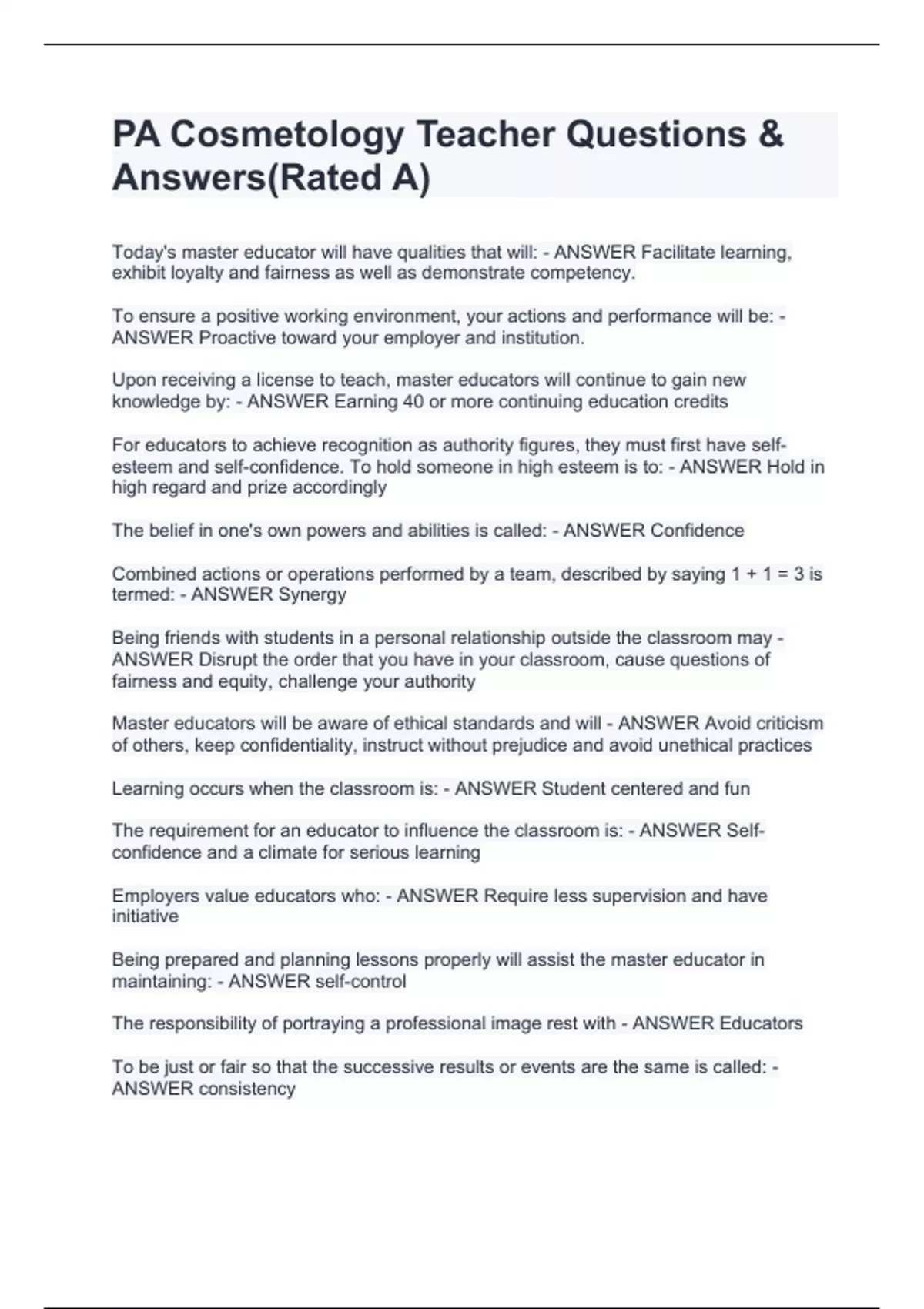 Today's master educator will have qualities that will: - ANSWER Facilitate learning, exhibit loyalty and fairness as well as demonstrate competency. To ensure a positive working environment, your actions and performance will be: - ANSWER Proactive toward your employer and institution. Upon receiving a license to teach, master educators will continue to gain new knowledge by: - ANSWER Earning 40 or more continuing education credits For educators to achieve recognition as authority figures, they must first have self-esteem and self-confidence. To hold someone in high esteem is to: - ANSWER Hold in high regard and prize accordingly The belief in one's own powers and abilities is called: - ANSWER Confidence Combined actions or operations performed by a team, described by saying 1 + 1 = 3 is termed: - ANSWER Synergy Being friends with students in a personal relationship outside the classroom may - ANSWER Disrupt the order that you have in your classroom, cause questions of fairness and equity, challenge your authority Master educators will be aware of ethical standards and will - ANSWER Avoid criticism of others, keep confidentiality, instruct without prejudice and avoid unethical practices Learning occurs when the classroom is: - ANSWER Student centered and fun The requirement for an educator to influence the classroom is: - ANSWER Self-confidence and a climate for serious learning Employers value educators who: - ANSWER Require less supervision and have initiative Being prepared and planning lessons properly will assist the master educator in maintaining: - ANSWER self-control The responsibility of portraying a professional image rest with - ANSWER Educators To be just or fair so that the successive results or events are the same is called: - A