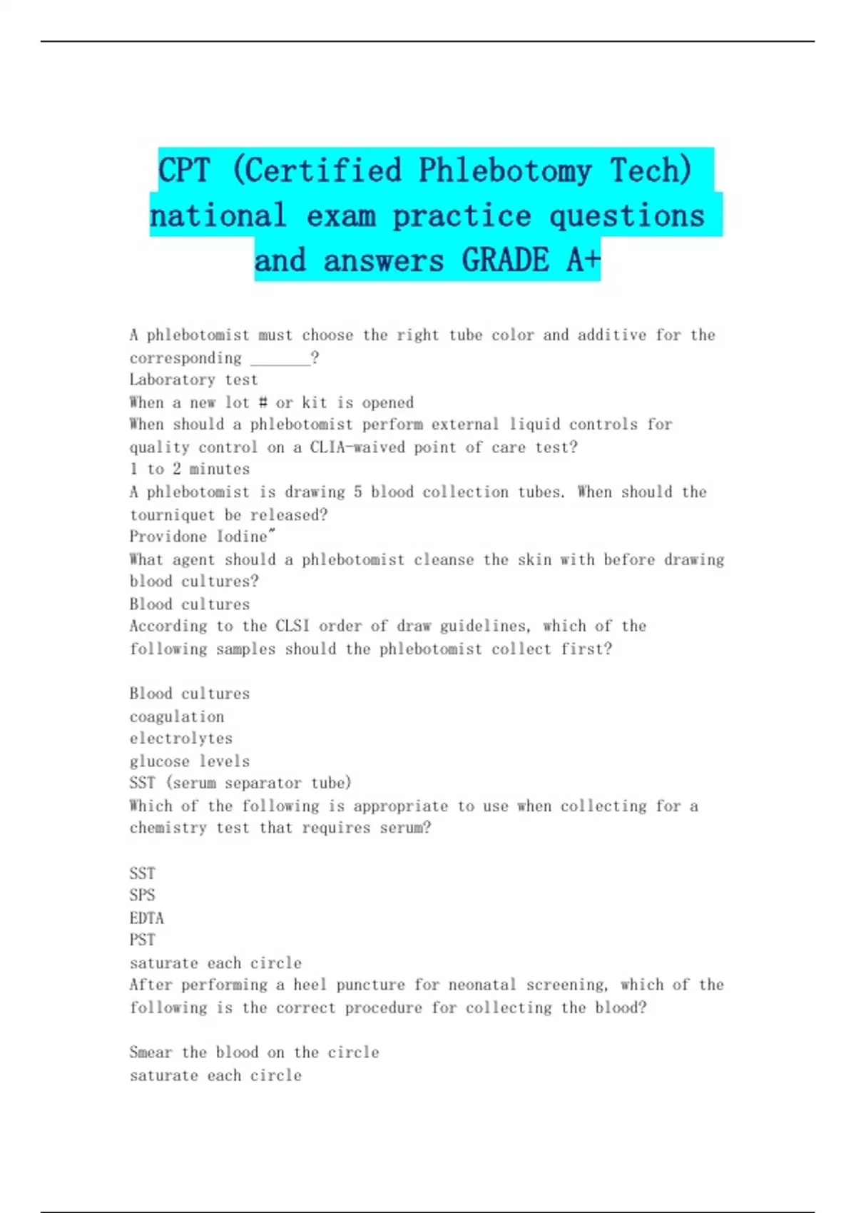 CPT (Certified Phlebotomy Tech) national exam practice questions and answers GRADE A+