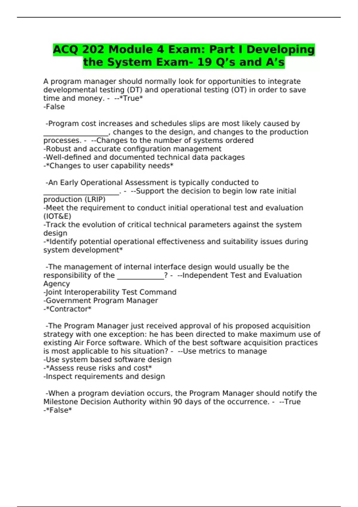 ACQ 202 Module 4 Exam: Part I Developing the System Exam- 19 Q’s and A’s