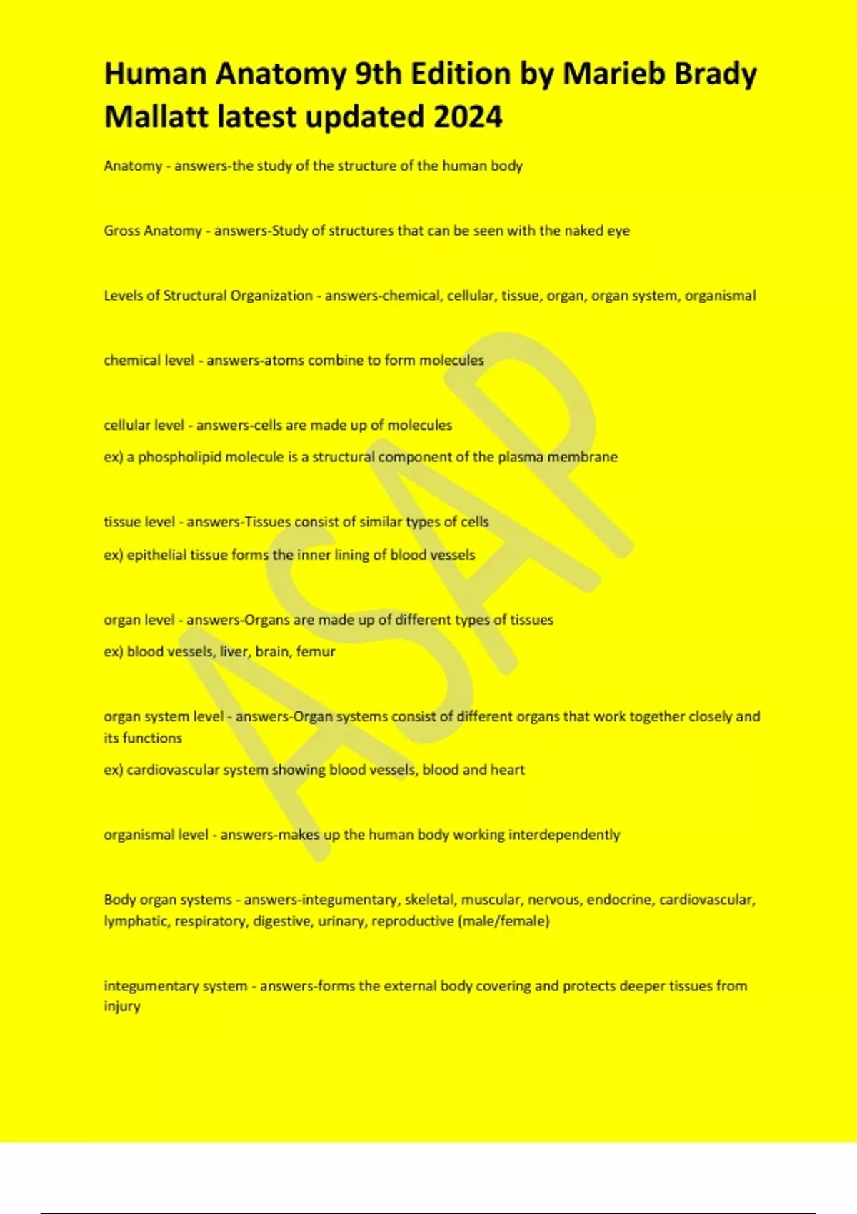 Human Anatomy 9th Edition by Marieb Brady Mallatt latest updated 2024 Anatomy - answers-the study of the structure of the human body Gross Anatomy - answers-Study of structures that can be seen with the naked eye Levels of Structural Organization - answers-chemical, cellular, tissue, organ, organ system, organismal