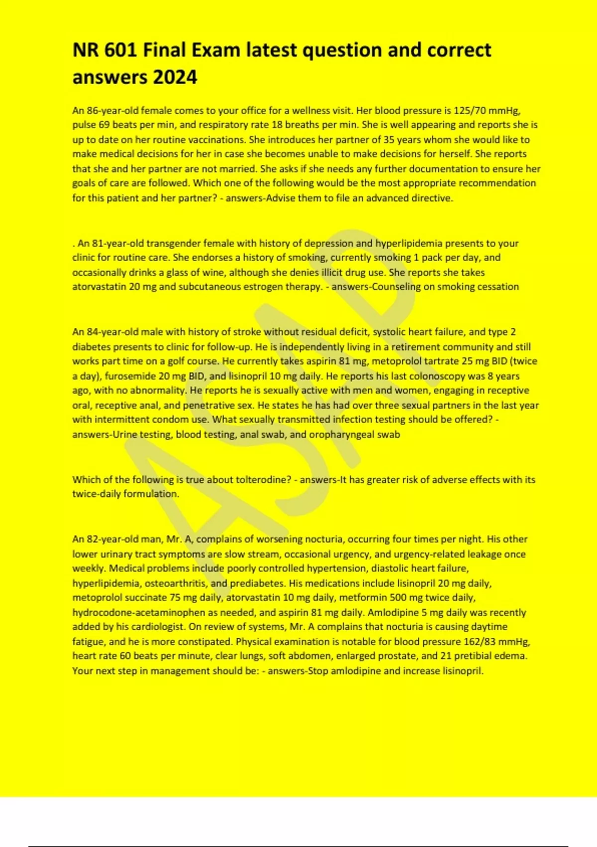 NR 601 Final Exam latest question and correct answers 2024 An 86-year-old female comes to your office for a wellness visit. Her blood pressure is 125/70 mmHg, pulse 69 beats per min, and respiratory rate 18 breaths per min. She is well appearing and reports she is up to date on her routine vaccinations. She introduces her partner of 35 years whom she would like to make medical decisions for her in case she becomes unable to make decisions for herself. She reports that she and her partner are not married. She asks if she needs any further documentation to ensure her goals of care are followed. Which one of the following would be the most appropriate recommendation for this patient and her partner? - answers-Advise them to file an advanced di