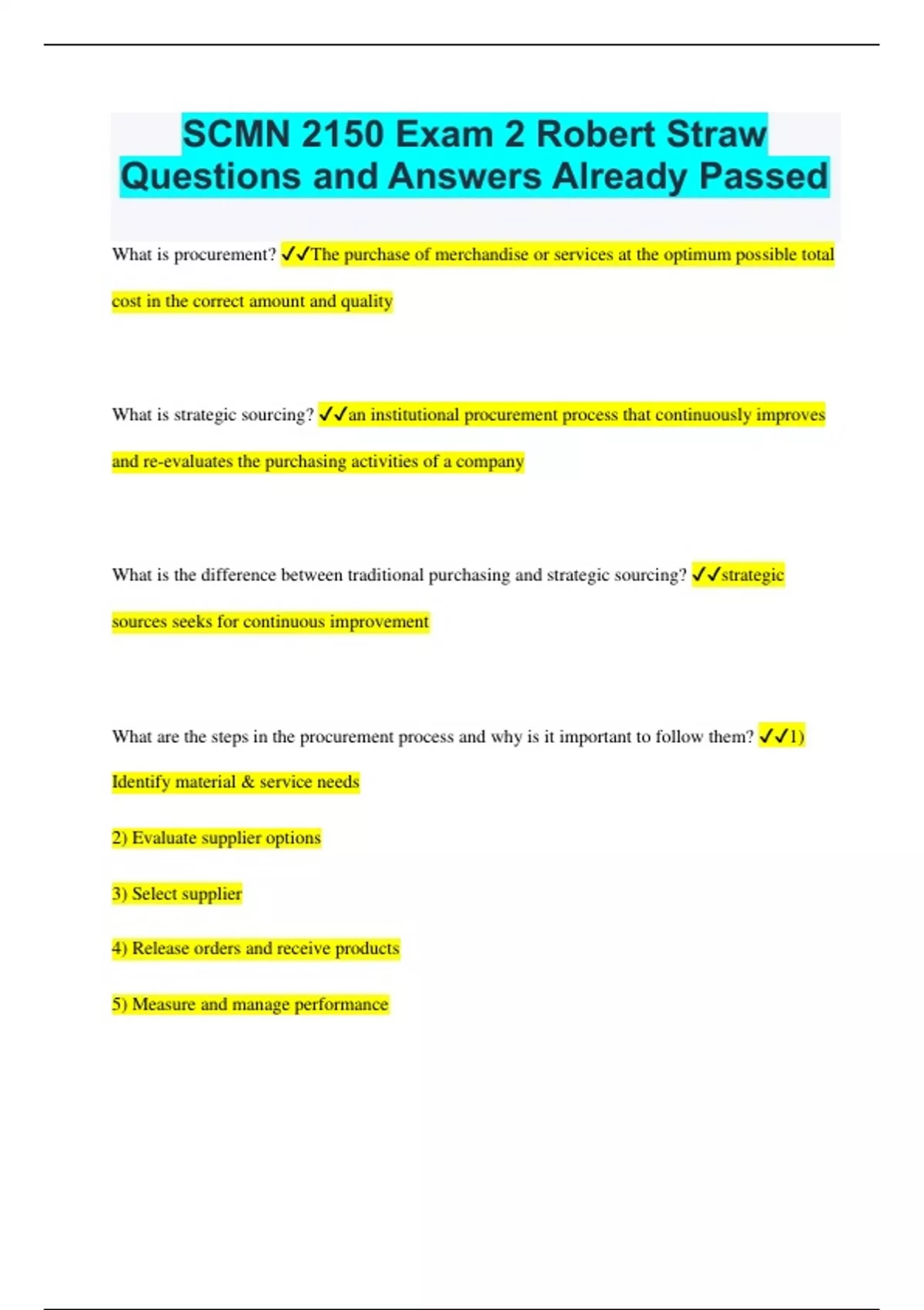 SCMN 2150 Exam 2 Robert Straw Questions and Answers Already Passed What is procurement? The purchase of merchandise or services at the optimum possible total cost in the correct amount and quality What is strategic sourcing? an institutional procurement process that continuously improves and re-evaluates the purchasing activities of a company What is the difference between traditional purchasing and strategic sourcing? strategic sources seeks for continuous improvement What are the steps in the procurement process and why is it important to follow them? 1) Identify material & service needs 2) Evaluate supplier options 3) Select supplier 4) Release orders and receive products 5) Measure and manage performance It is important to follow these steps because you do not want to make a decision based on incomplete information What are the goals of supply chain management and why is it important? To buy products and services.... - At the right price - From the right source - At the right specification - In the right quantity - For delivery at the right time - To the right internal customer It is important because it wants to generate a sustainable advantage through lower costs, higher quality, and better service from our global supply base of trading partners What is a quadrant analysis and why is it important? A quadrant analysis is a visual tool that categorizes data or elements into four quadrants based on two criteria, helping to prioritize and make decisions from either the products or services. It is important for simplifying complex data, identifying trends, and making informed choices in various fields. Why is it important to evaluate supplier performance? - To monitor KPIs (key performance indicators) and take corrective action, to ensure value is provided by suppliers - To create visibility into process and performance across the entire supply management lifecycle Fill Rate Total Quantity Received / Total Quantity Ordered Defect Rate Total Quantity Defective / Total Quantity Received On Time Orders Received On Time / Total Orders Perfect Purchase Order Percent Order arrives on time, without defects, and with perfect documentation at the right location with correct quantities of all SKUs (stock keeping unit) ordered What is a supplier scorecard and how are they created and utilized? - Monitor performance across multiple metrics over extended time period - Categorize suppliers based on their scores