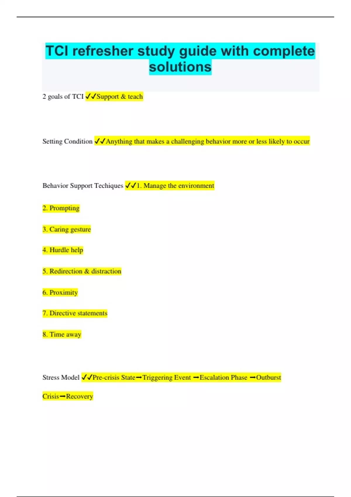 TCI refresher study guide with complete solutions 2 goals of TCI Support & teach Setting Condition Anything that makes a challenging behavior more or less likely to occur Behavior Support Techiques 1. Manage the environment 2. Prompting 3. Caring gesture 4. Hurdle help 5. Redirection & distraction 6. Proximity 7. Directive statements 8. Time away Stress Model Pre-crisis StateTriggering Event Escalation Phase Outburst CrisisRecovery Pre-disposing Risk Factors 1. Obesity 2. Under the influence of alcohol/drugs 3. Underlying natural disease 4. Hot, humid environment Goals for Emotional First Aid 1. Provide immediate help & support to reduce emotional intensity 2. Resolve the immediate crisis 3. Keep the student in the classroom or activity Steps for Life Space Interview (LSI) I - Isolate the conversation E - Explore student's point of view S - Summarize the feelings and content C - Connect the feelings to behavior A - Alternative behavior discussed P - Plan developed and Practice new behavior E - Enter student back into classroom Non-Verbal Co-regulation Strategies 1. Take a deep breath 2. Protective stance 3. Step back 4. Give the situation time 5. Sit down if appropriate 6. Body language/facial expression Do not use a physical restraint when: 1. You cannot control the student safely 2. You are not in control 3. In a public place 4. Student's medical condition prohibits