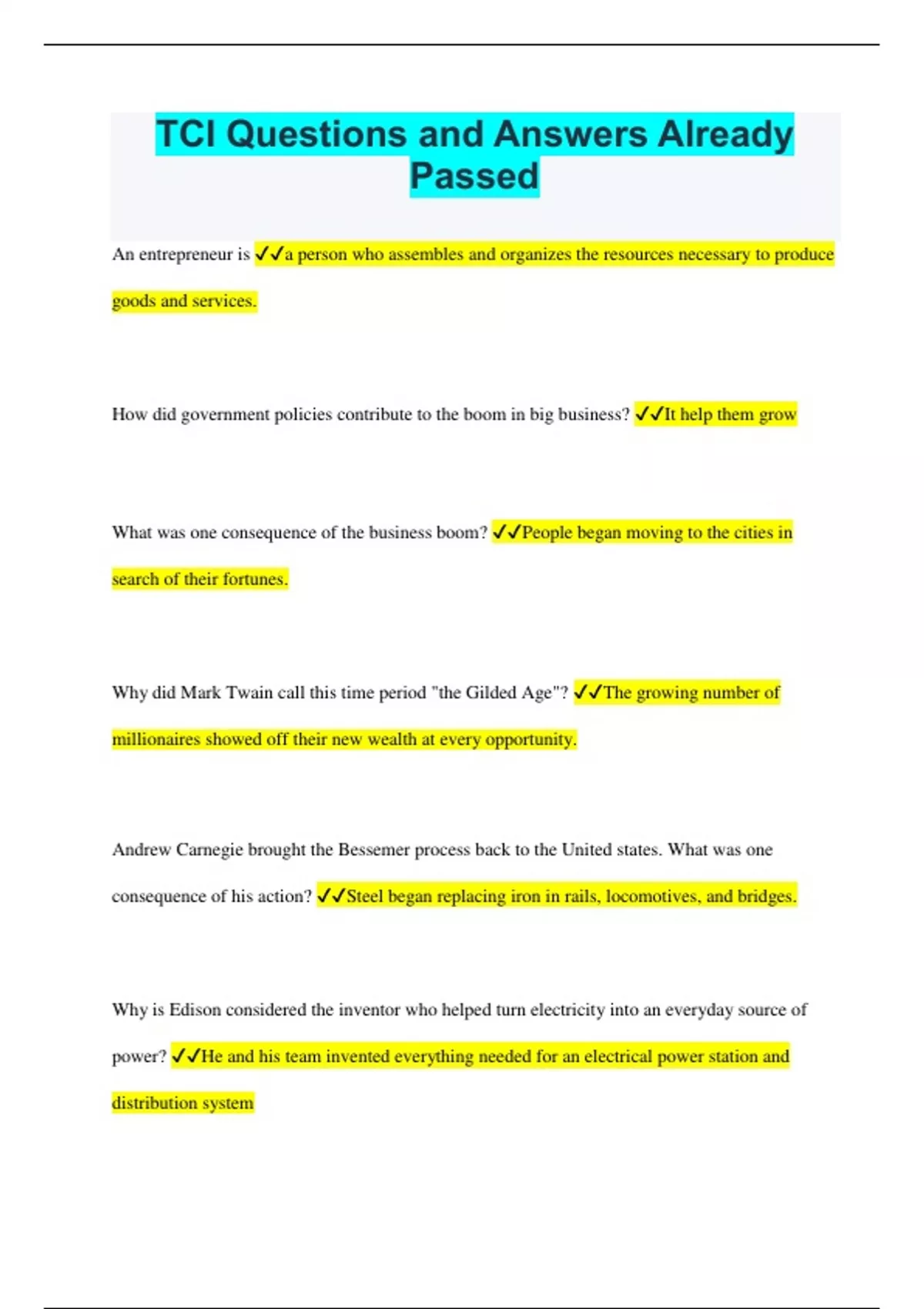 TCI Questions and Answers Already Passed An entrepreneur is a person who assembles and organizes the resources necessary to produce goods and services. How did government policies contribute to the boom in big business? It help them grow What was one consequence of the business boom? People began moving to the cities in search of their fortunes. Why did Mark Twain call this time period "the Gilded Age"? The growing number of millionaires showed off their new wealth at every opportunity. Andrew Carnegie brought the Bessemer process back to the United states. What was one consequence of his action? Steel began replacing iron in rails, locomotives, and bridges. Why is Edison considered the inventor who helped turn electricity into an everyday source of power? He and his team invented everything needed for an electrical power station and distribution system The inventor who created the telephone was Alexander Graham Bell. What was Henry Ford's great achievement? He mass-produced automobiles cheaply using a moving assembly line. Why were big businesses usually set up as corporations, rather than as partnerships? They needed more money to start up than just a few partners could provide. A trust is a group of corporations run by a single board of directors. Why did entrepreneurs create trusts in many different industries? Trusts made their industries more efficient and profitable What concern did some people have about trusts and the political process? Wealthy entrepreneurs were buying elections and corrupting public officials. What is the connection between industrialization and urbanization? People looking for jobs flocked to the cities, where most of the new industries were. Which words describe the tenements where
