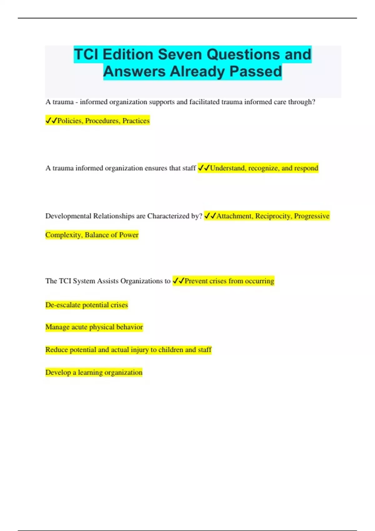 TCI Edition Seven Questions and Answers Already Passed A trauma - informed organization supports and facilitated trauma informed care through? Policies, Procedures, Practices A trauma informed organization ensures that staff Understand, recognize, and respond Developmental Relationships are Characterized by? Attachment, Reciprocity, Progressive Complexity, Balance of Power The TCI System Assists Organizations to Prevent crises from occurring De-escalate potential crises Manage acute physical behavior Reduce potential and actual injury to children and staff Develop a learning organization Effective TCI implementation Includes Leadership & program support, child and family inclusion, clinical participation, supervision and post crisis response, training & competency standards, documentation & incident monitoring & feedback Therapeutic Milieu The combination of people, emotions, attitudes, and objects that create a sense of safety, respect, belonging, care, and accountability. Spaces within the therapeutic milieu Ideological, physical, cultural, social, and emotional Setting Conditions Anything that makes challenging behavior or traumatic stress responses more or less likely to occur Foundations for intentional use of self Self awareness, self reflection, relationship skills and attunement, self care Pain Based Behaviors Behaviors that are the result of emotional and psychological pain A crisis occurs when A child's fight, flight, or freeze response is activated and they are unable to regulate their emotions and behaviors. Recovery phase outcomes Higher, No Change, Lower Four questions we ask ourselves in a crisis situation What am I feeling now? What does young person feel, need, expect, or want? How is the environment affecting the situation? How do I best respond? Behavior support techniques Manage environment, prompting, caring gesture, hurdle help, redirection and distractions,proximity,directive statements, time away Goals of emotional first aid 1. Provide immediate help and support to reduce emotional intensity 2. Identify and resolve the underlying concerns causing distress 3. Keep the child in the activity