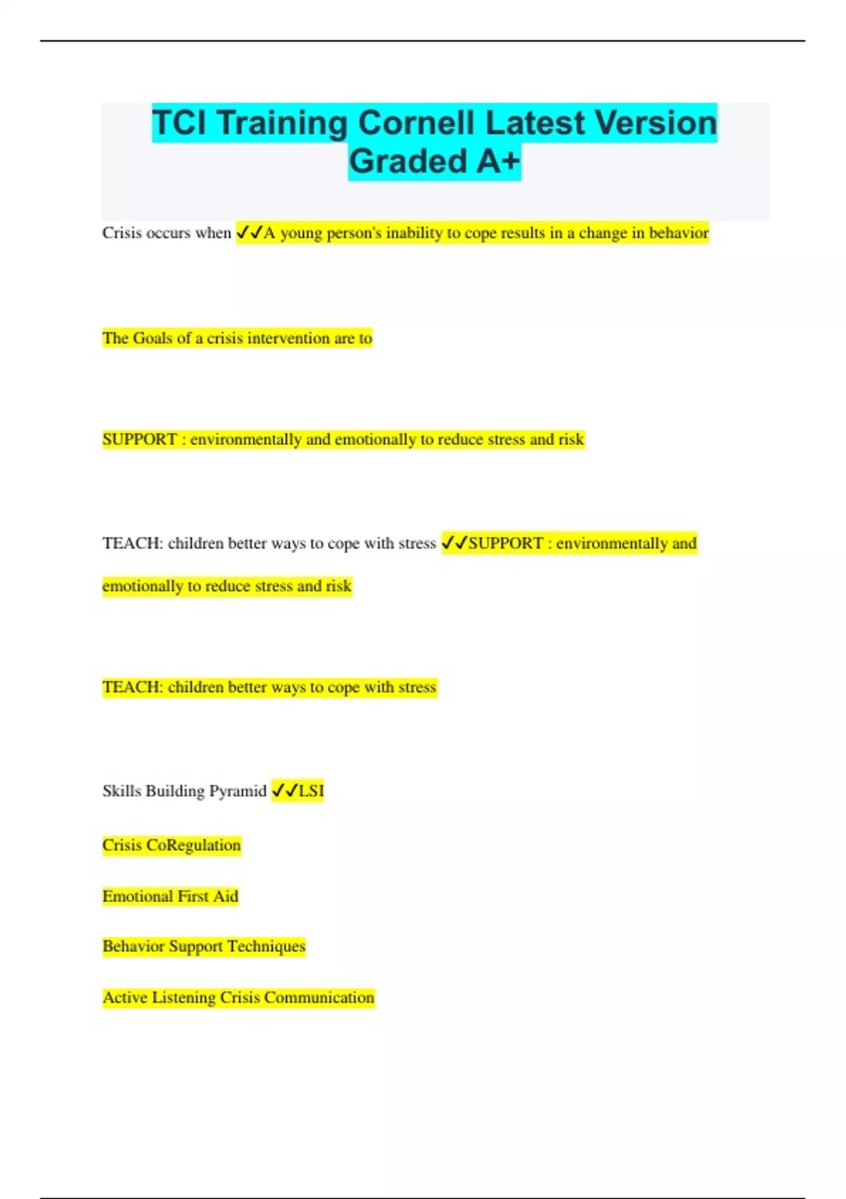 TCI Training Cornell Latest Version Graded A+ Crisis occurs when A young person's inability to cope results in a change in behavior The Goals of a crisis intervention are to SUPPORT : environmentally and emotionally to reduce stress and risk TEACH: children better ways to cope with stress SUPPORT : environmentally and emotionally to reduce stress and risk TEACH: children better ways to cope with stress Skills Building Pyramid LSI Crisis CoRegulation Emotional First Aid Behavior Support Techniques Active Listening Crisis Communication Self Awareness - Four Questions Stress model of crisis Pre-crisis State (Baseline) Triggering Event - Agitation Escalation Phase - Aggression Outburst CRISIS - Violence Recovery FOUR questions to ask ourselves in a crisis situation What am I feeling now? What does this young person feel need want How is the environment affecting the young person? How do I respond? How do I best respond? Provide environmental support by managing the environment to neutralize potential triggers Provide emotional support by engaging the young person Exercise self-control over your own feelings What am I feeling now? Anger can undermine objectivity Anger is an emotional and physical response Cognitive abilities are reduced Pain based behavior includes Impulsive