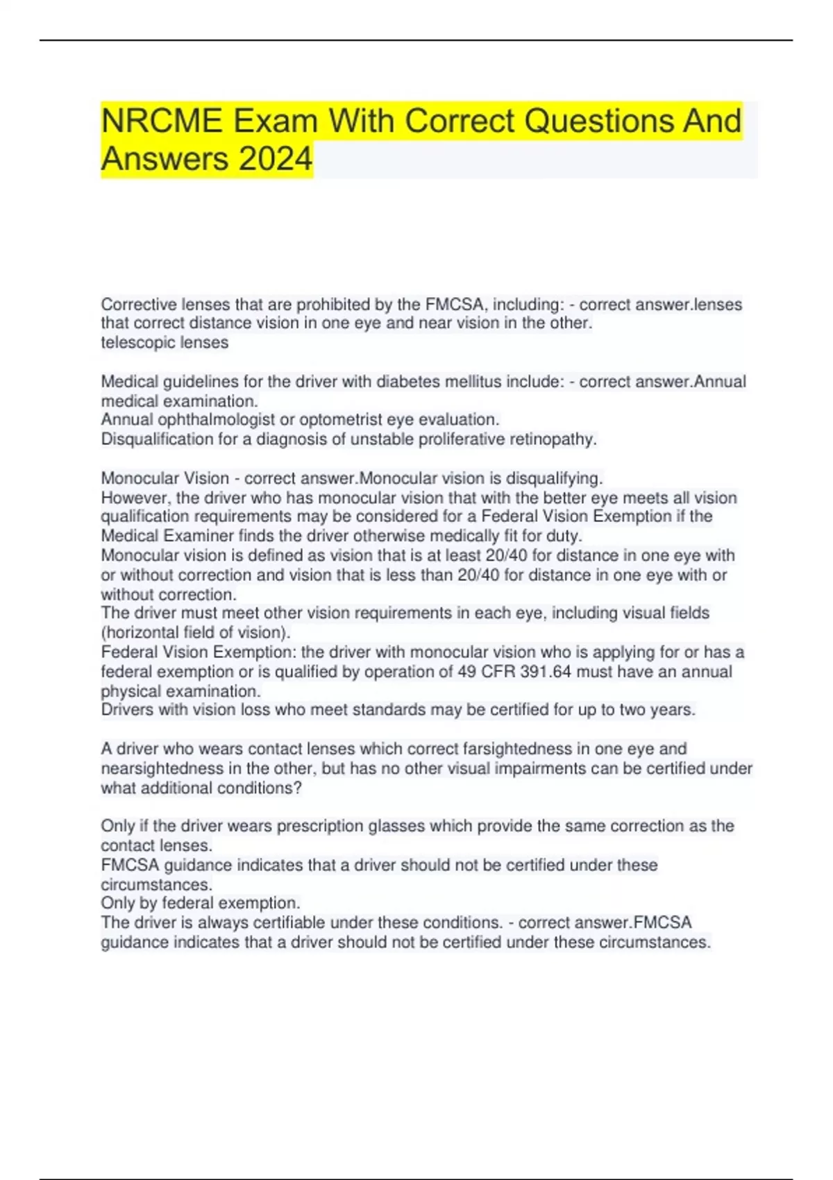 NRCME Exam With Correct Questions And Answers 2024 Corrective lenses that are prohibited by the FMCSA, including: - correct s that correct distance vision in one eye and near vision in the other. telescopic lenses Medical guidelines for the driver with diabetes mellitus include: - correct answer.Annual medical examination. Annual ophthalmologist or optometrist eye evaluation. Disqualification for a diagnosis of unstable proliferative retinopathy. Monocular Vision - correct answer.Monocular vision is disqualifying. However, the driver who has monocular vision that with the better eye meets all vision qualification requirements may be considered for a Federal Vision Exemption if the Medical Examiner finds the driver otherwise medically fit for duty. Monocular vision is defined as vision that is at least 20/40 for distance in one eye with or without correction and vision that is less than 20/40 for distance in one eye with or without correction. The driver must meet other vision requirements in each eye, including visual fields (horizontal field of vision). Federal Vision Exemption: the driver with monocular vision who is applying for or has a federal exemption or is qualified by operation of 49 CFR 391.64 must have an annual physical examination. Drivers with vision loss who meet standards may be certified for up to two years. A driver who wears contact lenses which correct farsightedness in one eye and nearsightedness in the other, but has no other visual impairments can be certified under what additional conditions? Only if the driver wears prescription glasses which provide the same correction as the contact lenses. FMCSA guidance indicates that a driver should not be certified under these circumstances. Only by federal exemption. The driver is always certifiable under these conditions. - correct answer.FMCSA guidance indicates that a driver should not be certified under these circumstances. Explanation: FMCSA guidance indicates that contact lenses that correct one eye for distance and one eye for near vision are not acceptable. Guidance recommends not to certify with ear problem diagnoses of: - correct answer.a) Uncontrolled vertigo. b) Ménière's disease. c) Nonfunctioning labyrinth. d) Nonfunctioning fistula. The medical examiner's role in the exemption process includes _________. Issuing the exemption. Issuing the prescription for the driver's contact lenses and/or glasses. Providing the driver with contact information for the Federal Vision Exemption Program. Assuring that the driver has peripheral vision of at least 110 degrees in each eye. - correct answer.Providing the driver with contact information for the Federal Vision Exemption Program. Explanation: The medical examiner's role in the exemption process is limited to performing the driver examination and providing the driver with contact information for the FMCSA related to the exemption process. An audiometric test produces the following results: Left ear: 500 Hz, 35dB Loss; 1,000 Hz, 35 dB loss; 2,000 Hz 45 dB loss. Right ear: 500 Hz, 40 dB loss; 1,000 Hz, 45 dB loss; 2,000 40 dB loss. What is the certification? Certify for one year. Certify for two years. Do not certify. Certify only when accompanied by hearing aid. - correct answer.Certify for two years. Explanation: Drivers with an average hearing loss of < 40 decibels averaged across 500, 1000, and 2000 Hz in the better ear may be certified for two years. What eye conditions must the medical examiner ask the driver about? Cataracts, color deficiencies, retinitis pigmentosa, aphakia, glaucoma. Lazy eye, cataracts, aphakia, floaters, retinopathy. Glaucoma, macular degeneration, retinitis pigmentosa, color deficiencies. Retinopathy, cataracts, aphakia, glaucoma, macular degeneration. - correct answer.Retinopathy, cataracts, aphakia, glaucoma, macular degeneration.