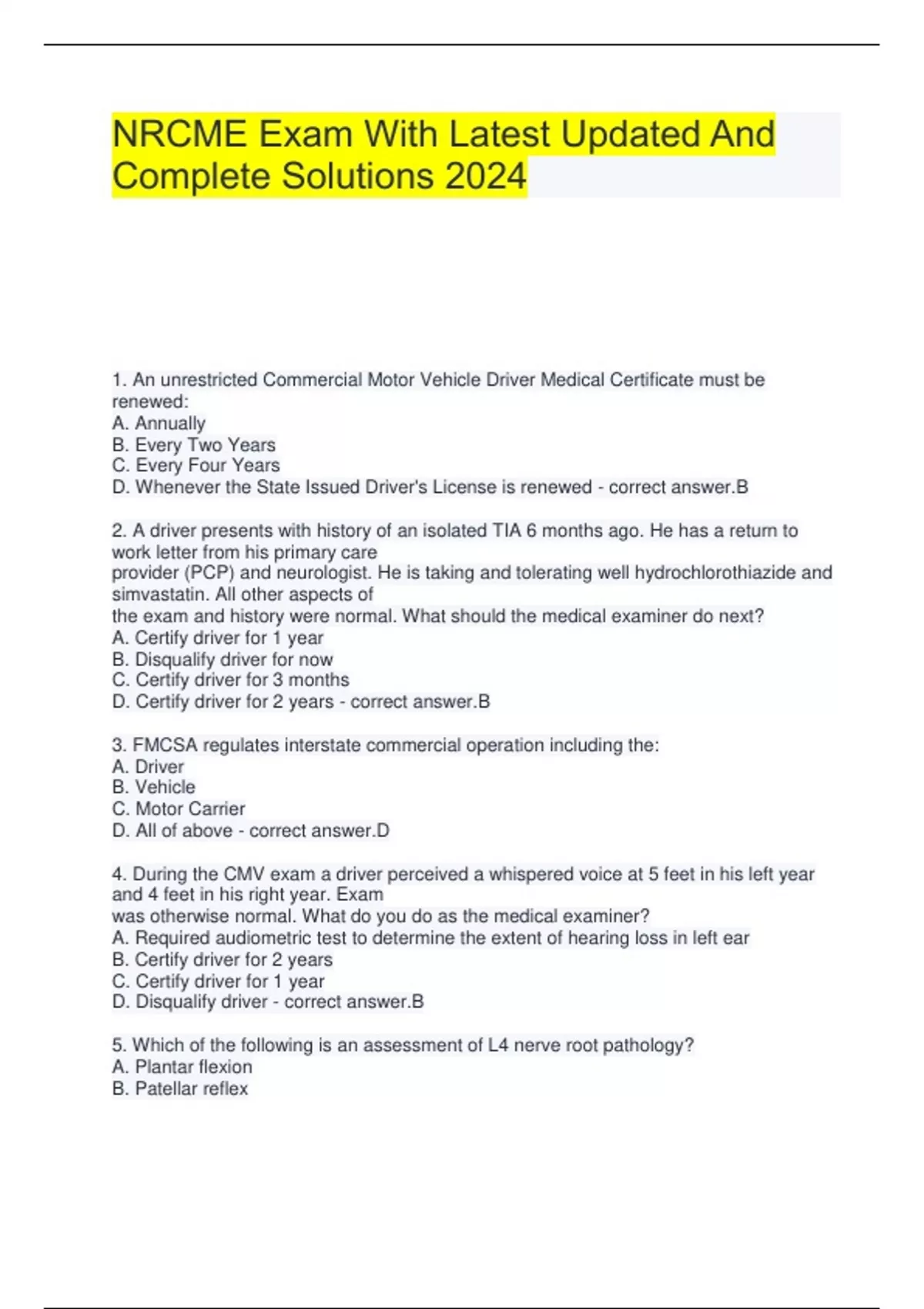 NRCME Exam With Latest Updated And Complete Solutions 2024 1. An unrestricted Commercial Motor Vehicle Driver Medical Certificate must be renewed: A. Annually B. Every Two Years C. Every Four Years D. Whenever the State Issued Driver's License is renewed - correct answer.B 2. A driver presents with history of an isolated TIA 6 months ago. He has a return to work letter from his primary care provider (PCP) and neurologist. He is taking and tolerating well hydrochlorothiazide and simvastatin. All other aspects of the exam and history were normal. What should the medical examiner do next? A. Certify driver for 1 year B. Disqualify driver for now C. Certify driver for 3 months D. Certify driver for 2 years - correct answer.B 3. FMCSA regulates interstate commercial operation including the: A. Driver B. Vehicle C. Motor Carrier D. All of above - correct answer.D 4. During the CMV exam a driver perceived a whispered voice at 5 feet in his left year and 4 feet in his right year. Exam was otherwise normal. What do you do as the medical examiner? A. Required audiometric test to determine the extent of hearing loss in left ear B. Certify driver for 2 years C. Certify driver for 1 year D. Disqualify driver - correct answer.B 5. Which of the following is an assessment of L4 nerve root pathology? A. Plantar flexion B. Patellar reflex C. Hip extension D. Babinski reflex - correct answer.B 6. A driver presents for medical exam and reports being a smoker and having frequent shortness of breath. What do you do next? A. Order an ECG B. Refer to a pulmonologist C. Order a spirometer test D. Provide 1 year certification - correct answer.C 7. According to regulation, which of the following must be evaluated as part of the eye exam? A. Pupil reaction B. Iris symmetry C. Conjunctiva injection D. Tonometry pressure - correct answer.A 8. Continued certification of NRCE Medical Examiners requires all EXCEPT which of the following? A. Periodic training at least every five years B. Completion of recertification test every five years C. Completion of certification test every 10 years D. Electronic transmission to FMCSA CMV Medical Examination Results at least monthly - correct answer.B 9. A driver presents for recertification. The only condition he lists is GERD, for which he takes OTC omeprazole. He says that when he is driving and eating fast foods, he is more likely to have heartburn than when off‐duty. You should: A. Request recent UGI results B. Correlate history with abdominal exam C. Certify for one year with restricted diet D. Discuss alternative employment - correct answer.B 10. Which of the following findings is disqualifying? A. Oxygen saturation 90% B. LVEF 40% C. FEV 68% predicted D. All of the above - correct answer.A 11. The driver presents for recertification and submits an ultrasound report indicating an abdominal aortic aneurysm from two months ago, shortly before he had surgical correction. He has surgical clearance and says he is doing well, has