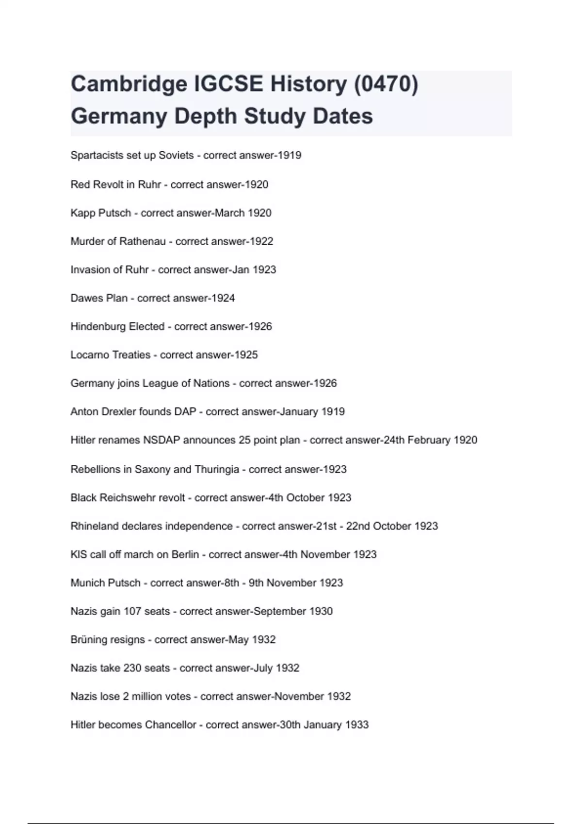 Cambridge IGCSE History (0470) Germany Depth Study Dates