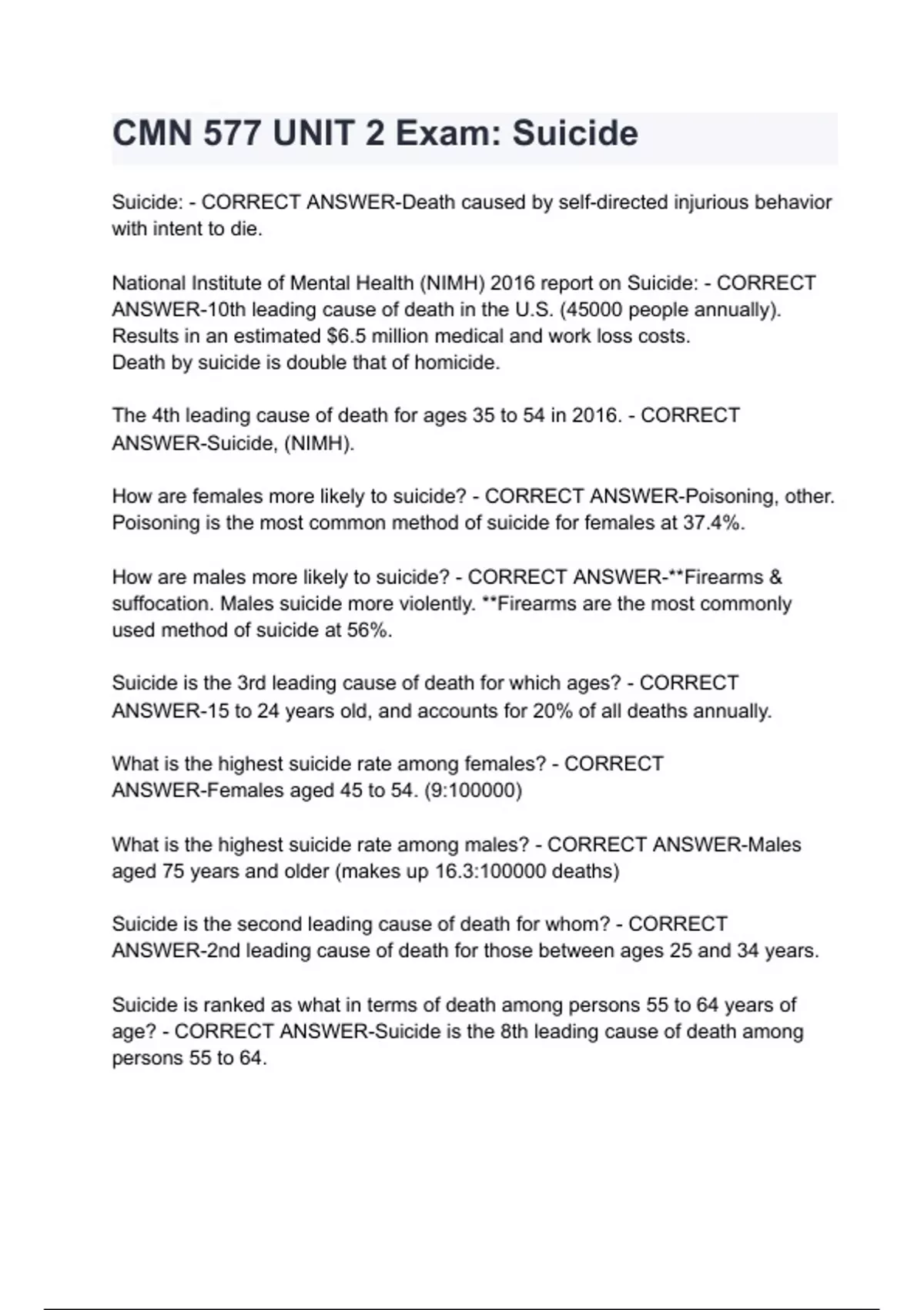 CMN 577 UNIT 2 Exam_ Suicide questions and answers latest 2024
