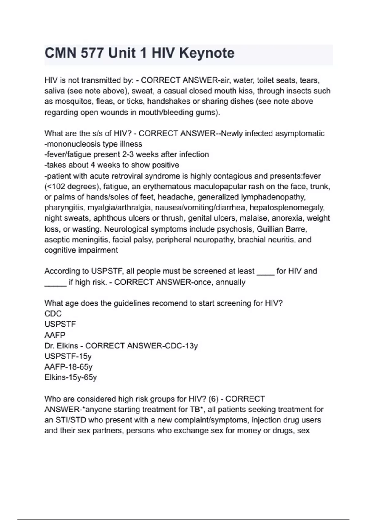 CMN 577 Unit 1 HIV Keynote questions and answers