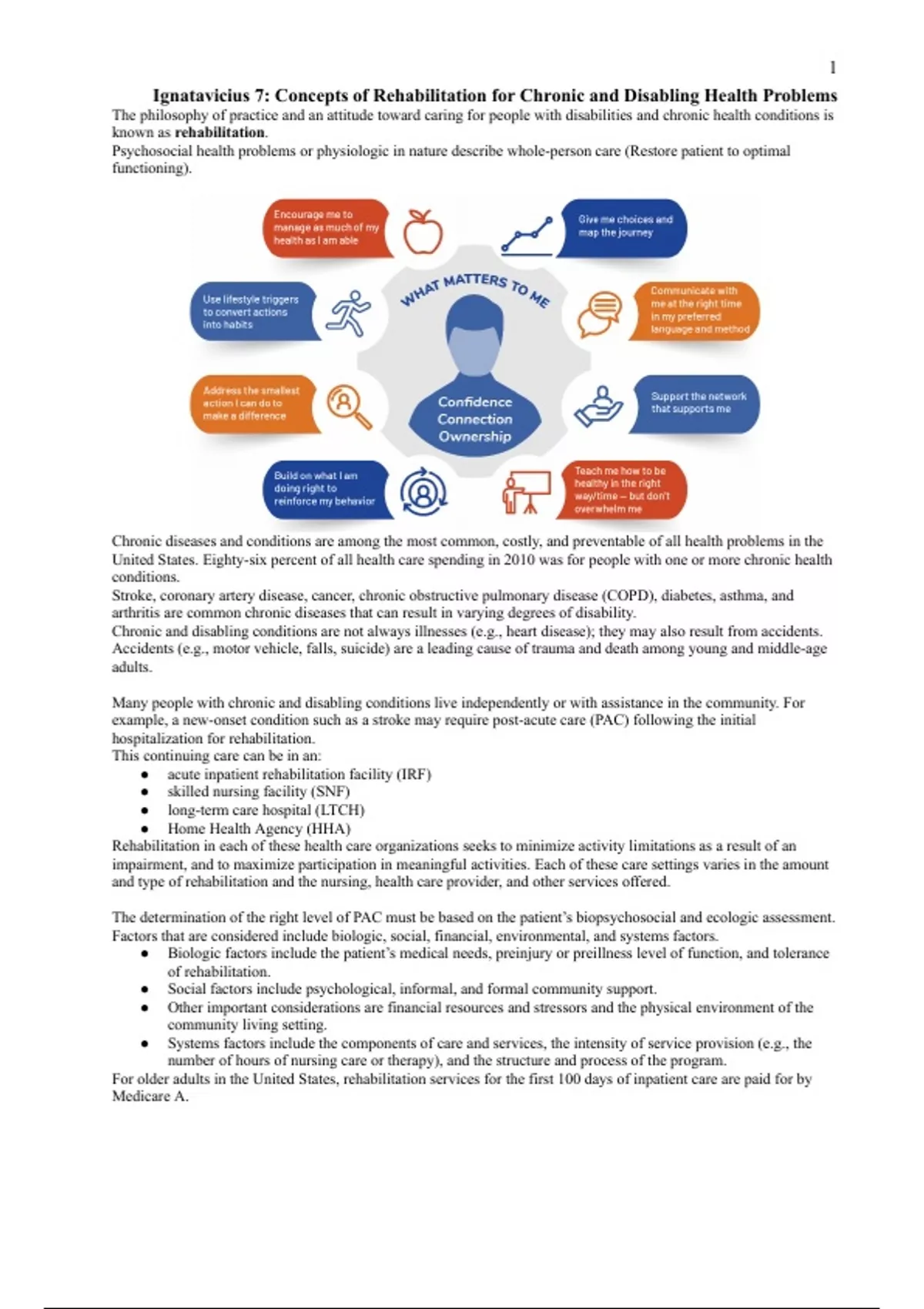 This document covers materials from books, classes, and saunders. It has everything needed for the exam. I hope it helps! The topic it covers: Ignatavicius 7: Concepts of Rehabilitation for Chronic and Disabling Health Problems; Giddens 2: Functional Ability; Ch 20: Health risk across the lifespan; Cardiac Chronic Illness & stroke; Disorder of Mobility- PD & MS; Disorder of Immunity- RA & SLE; Disorders of Genetics- SCD & CF.