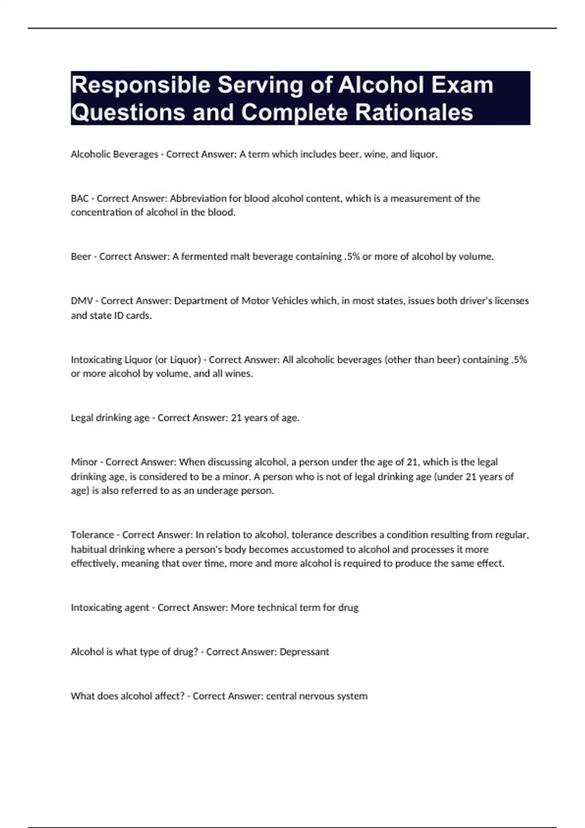 Responsible Serving of Alcohol Exam Questions and Complete Rationales